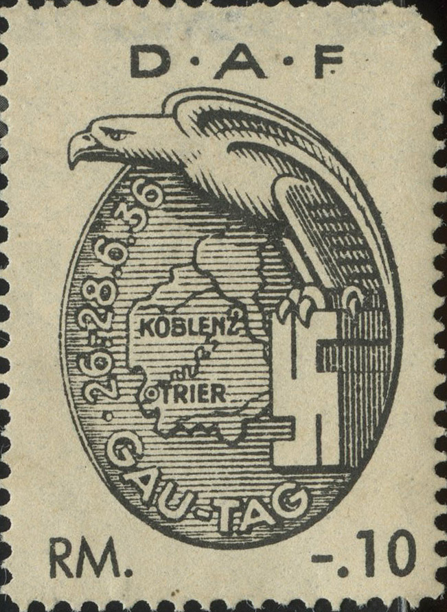 [Below: This is a cool high value (10 Reichsmark) stamp that was loose within the booklet. Celebrating Gau Tag (Koblenz/Trier districts), June 26-28, 1936. Koblenz is said to be one of 'Germany's oldest and most beautiful cities'. Like Koblenz, Trier is in the state of Rhineland-Palatinate, and is within the important Moselle wine region. Trier is considered to be Germany's oldest city, founded in the 4th century BC by Celts.]