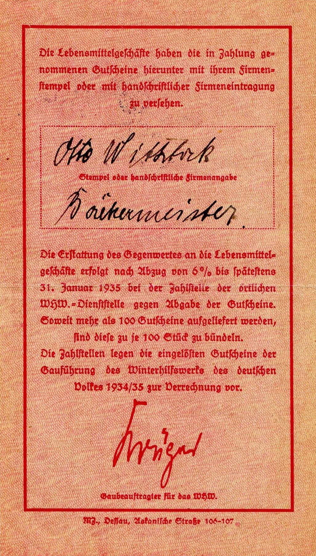[Below: This is considered a type 1 ration coupon from Milow, Germany. 1934/35. Front/reverse.]