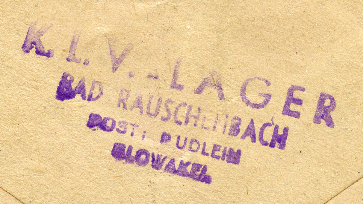 [Below: A seldom known part of the Third Reich was their 'Kinderlandverschickung' (Children Evacuation, KLV) program. As the twisted Allies waged war on German women and children, the National Socialists created the KLV to take children from cities and move them to the safer countryside. Various camps were set up, as you'll see below. First, let's look at a postcard. This is postmarked July 26, 1944 and was sent to Vienna, Austria from Bad Rauschenbach, Slovakia. The red stripe shows it was looked over by the censors. Click to enlarge and see the reverse.]