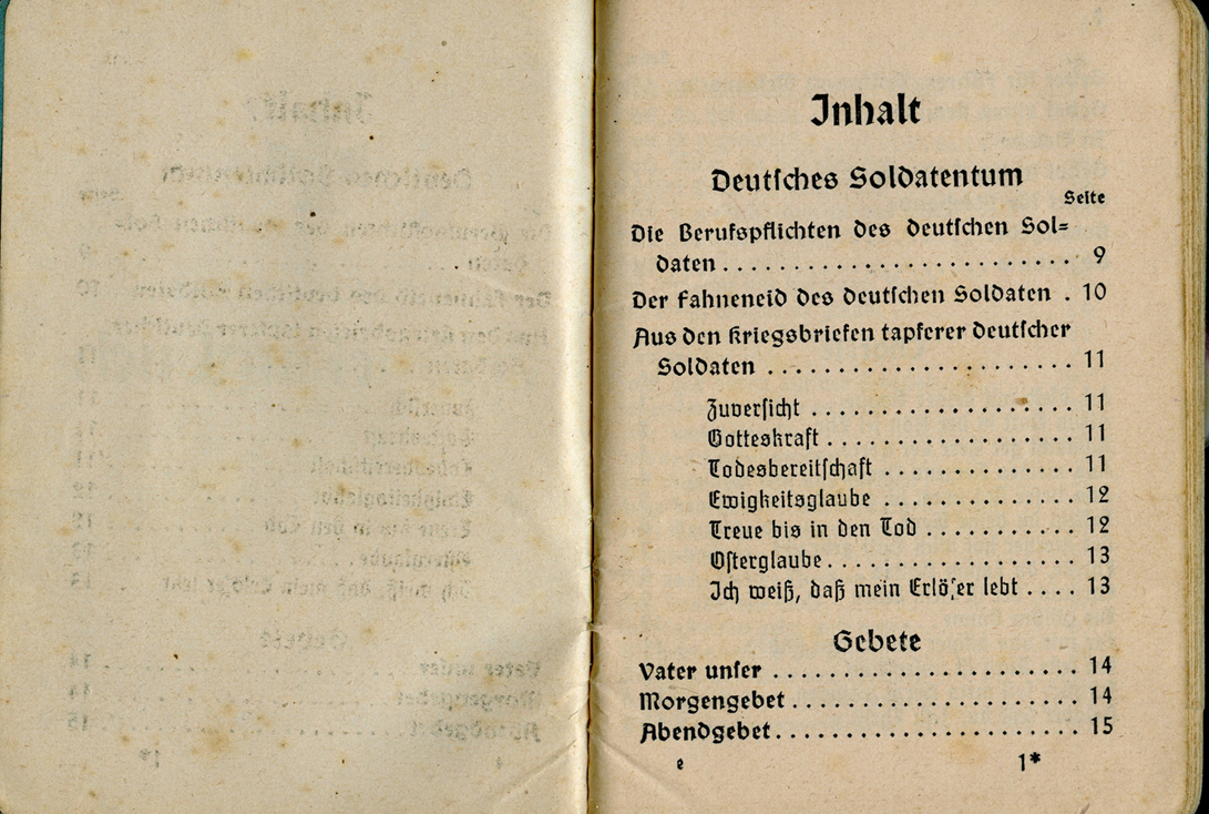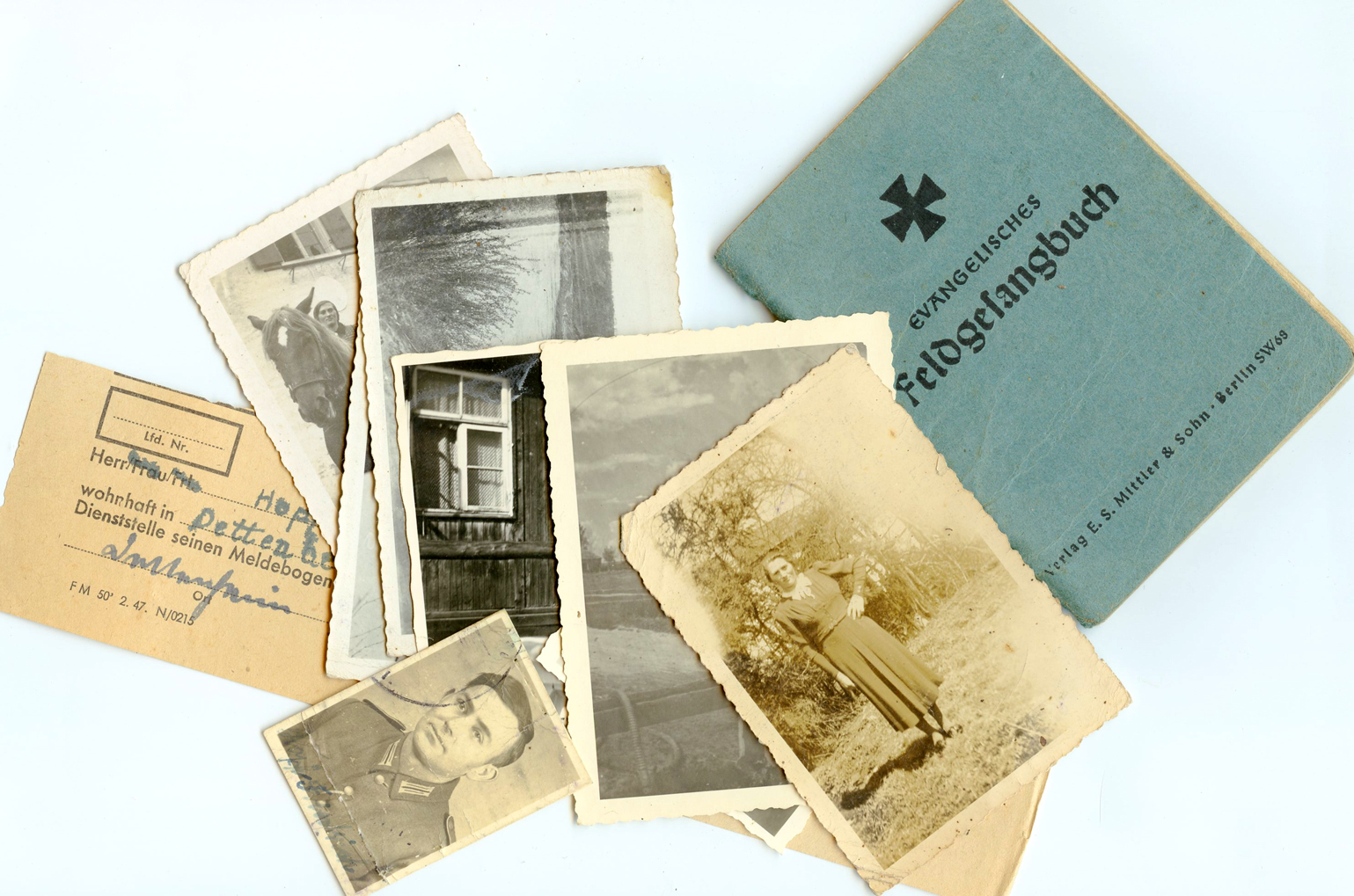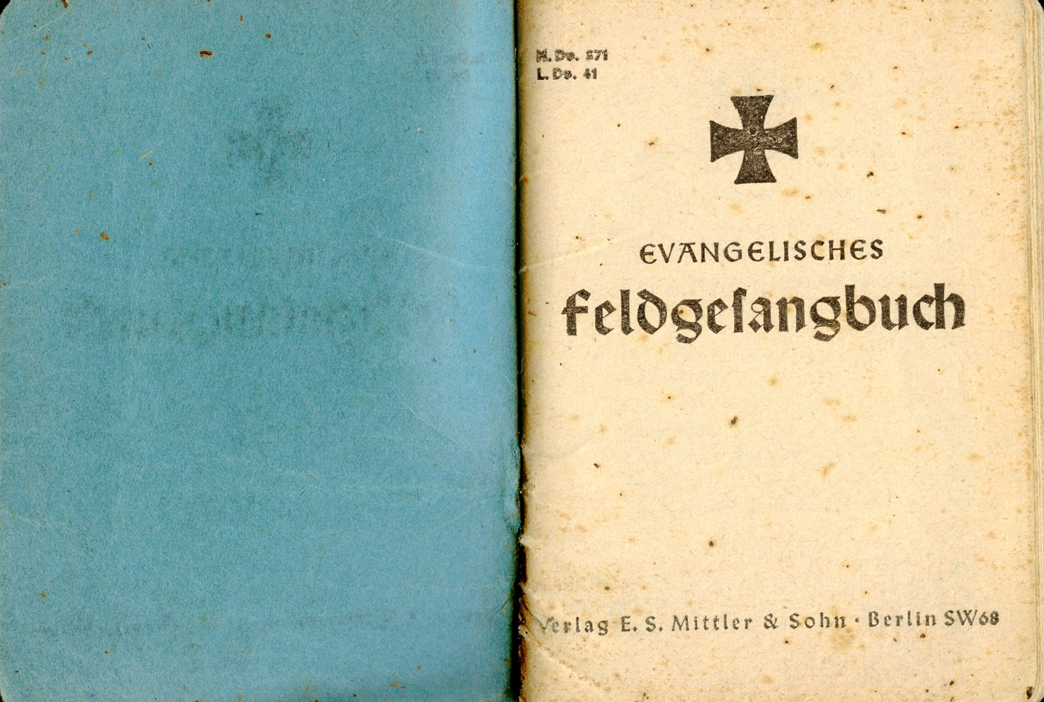 [Below: This is an Evangelisches Feldgefangbuch (Protestant Prisoner of War Book). You'll also see various pictures (and a paper) that were stuck within it. Click to enlarge.]