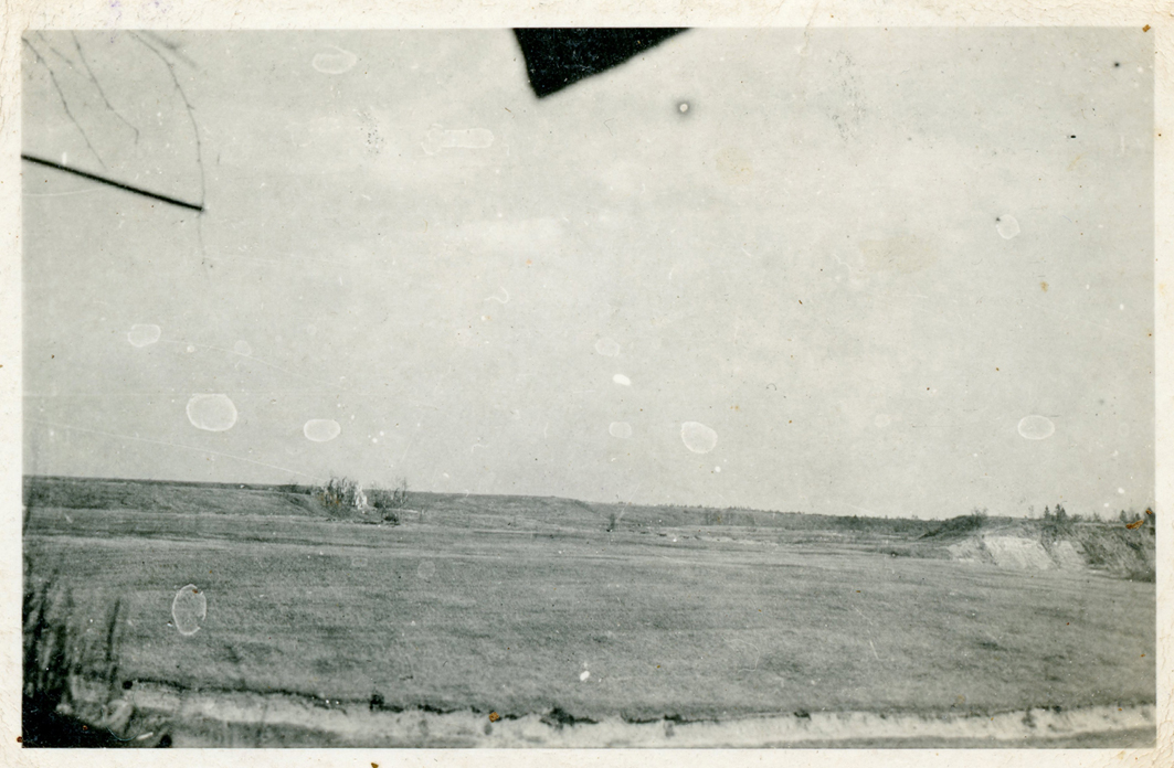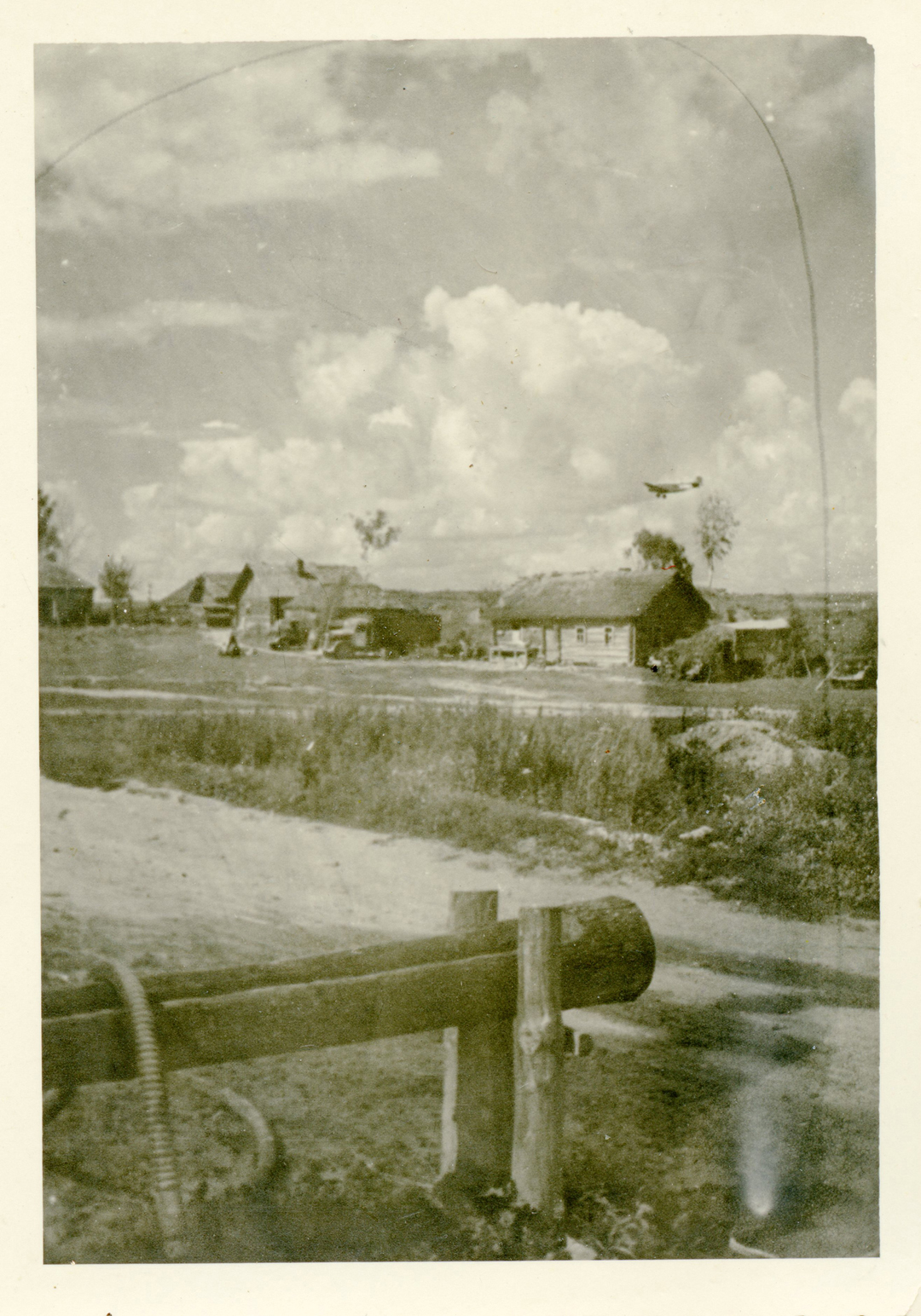 [Below: An unknown village showing heavy trucks and a low-flying plane. Click to enlarge.]