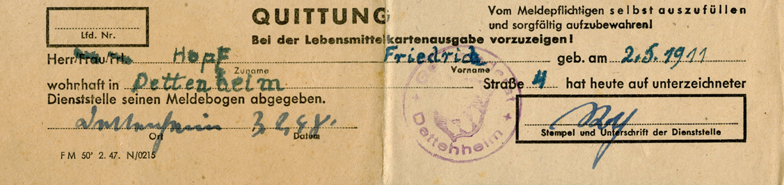 [Below: Slip of paper stuck within the book. It says: 'Quittung Bei der Lebensmittelkartenausgabe vorzuzeigen' (Receipt to be presented at the food card distribution). This was presented in early 1948 to a Friedrich Hopf, born May 2, 1911. Click to enlarge.]