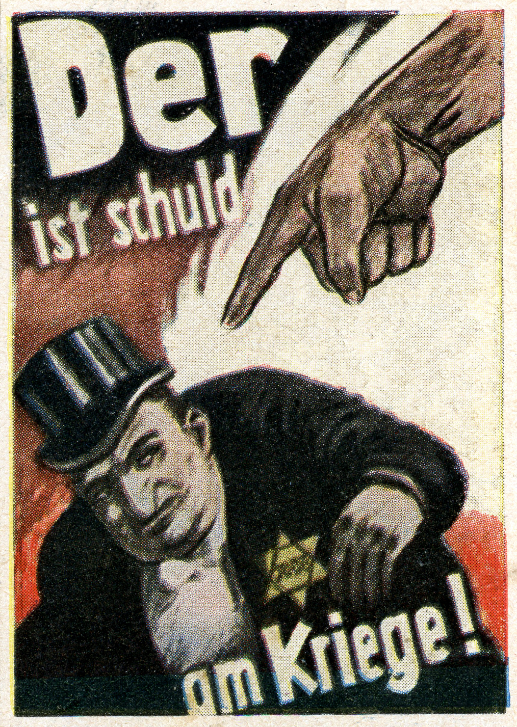 [Below: This is a large propaganda label for an envelope. It says: 'Der ist schuld am Kriege!' (He is to blame for the war!). Click to enlarge.]