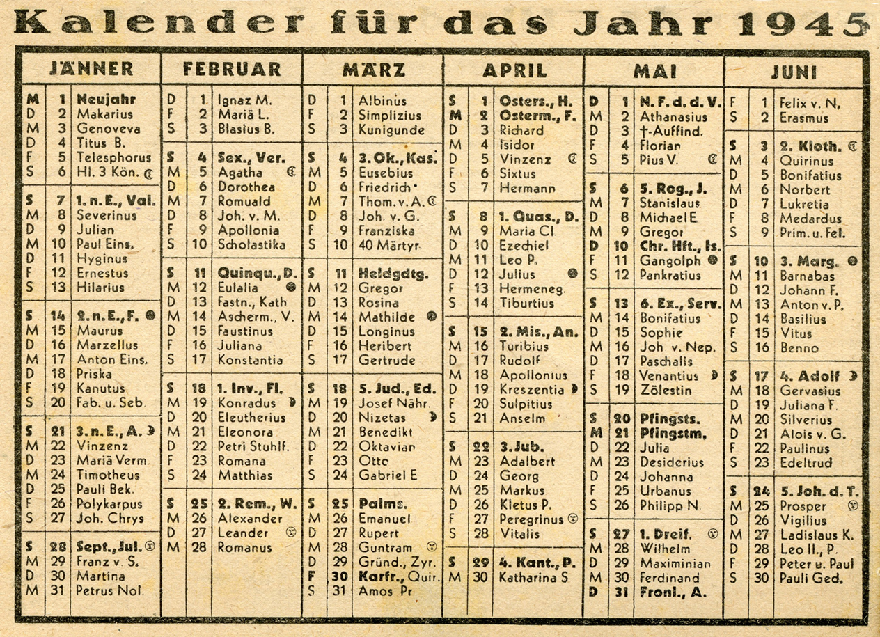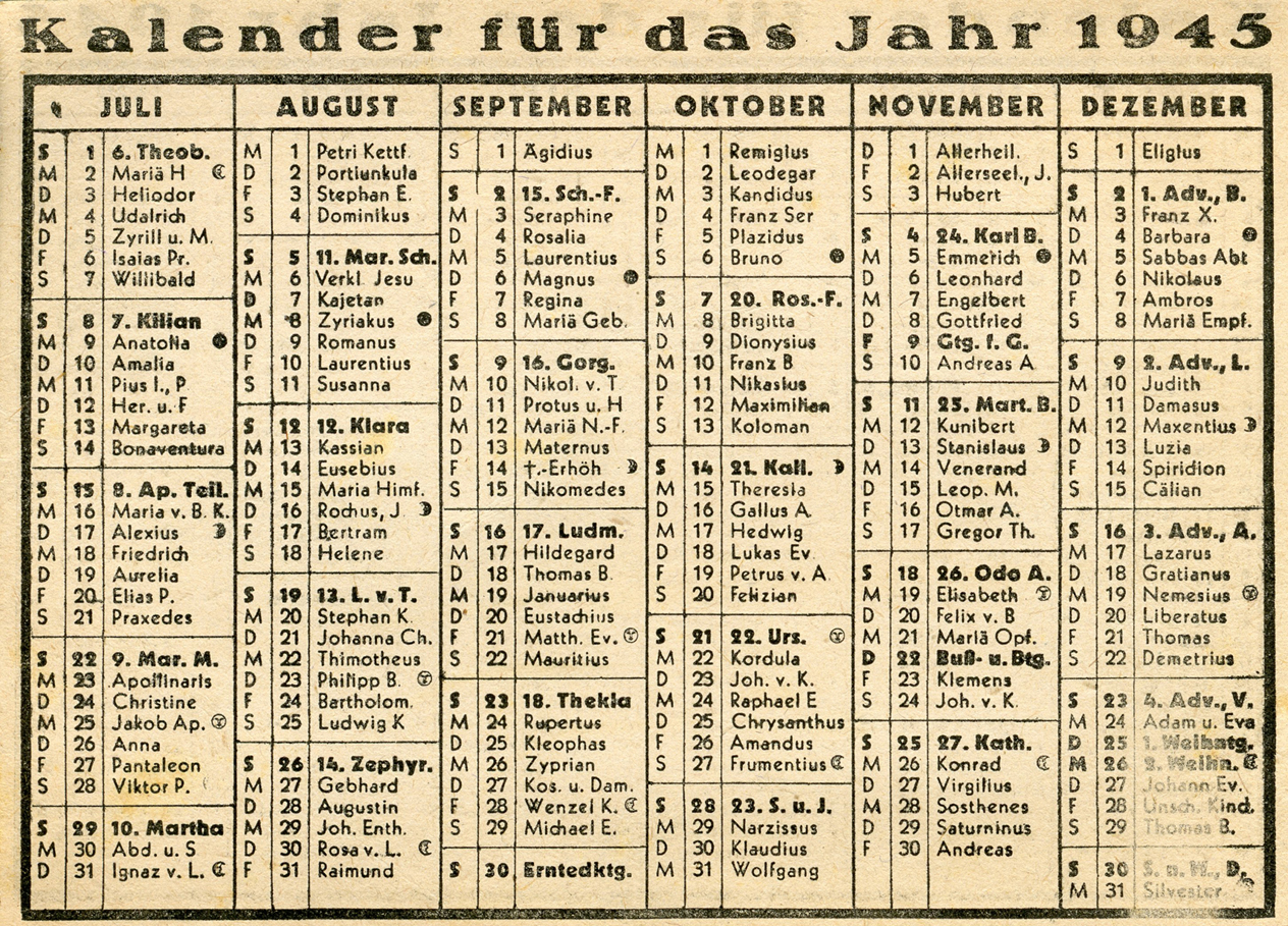 [Below: Pocket calendar for the dreadful year of 1945. This is about the size of a postcard and lists the names of many saints. Click to enlarge.]