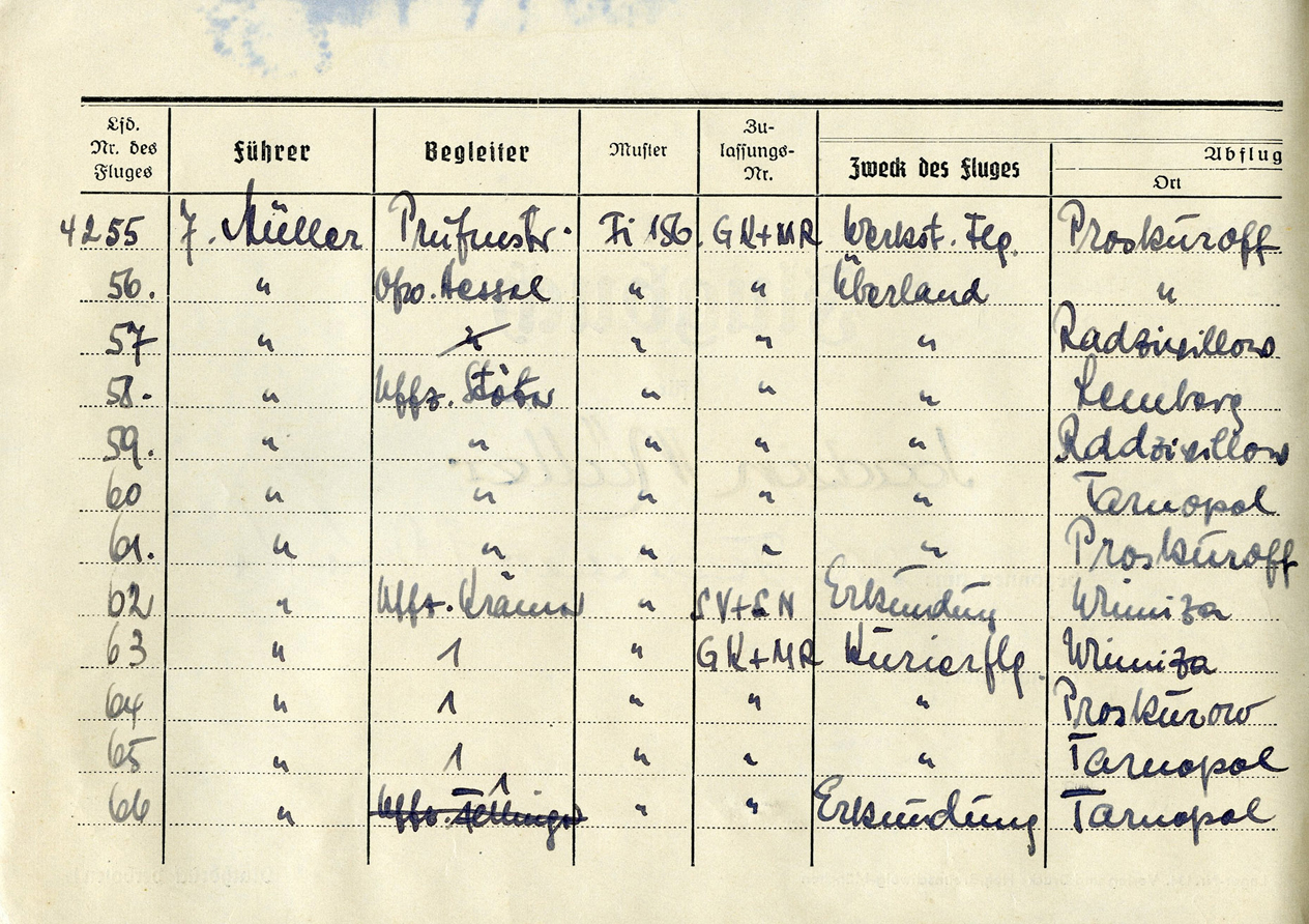[Below: Opening page. From left to right this says 'flight number, leader, co-pilot, model (of plane), approval number, purpose of flight, departure location'. On the upper left hand your notice under the 'flight number' it says 4255, he's on his 4255th flight?! Under 'muster/model' is says 'Fi 156' which means he flew a Fieseler Fi 156 Storch (a plane widely used for reconnaissance, among other uses). Under the departure location it says 'Prooküroff', which may be referrring to 'Prokhorovka', which lies on the border of Russia/Ukraine and is the location of the famous massive tank battle of Kursk during WWII. Also there are the locations of 'Tarnopol' and 'Proskürow' in western Ukraine. On the bottom row of 'purpose of flight' it says 'erkundung' which means 'exploration'.]