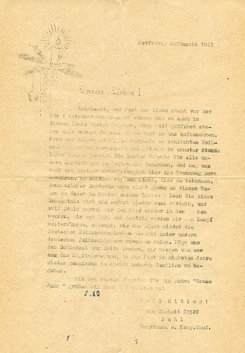 [Below: This is a Christmas message for soldiers on the eastern front from their company commander. Below is a rough translation into English. Click to enlarge.]