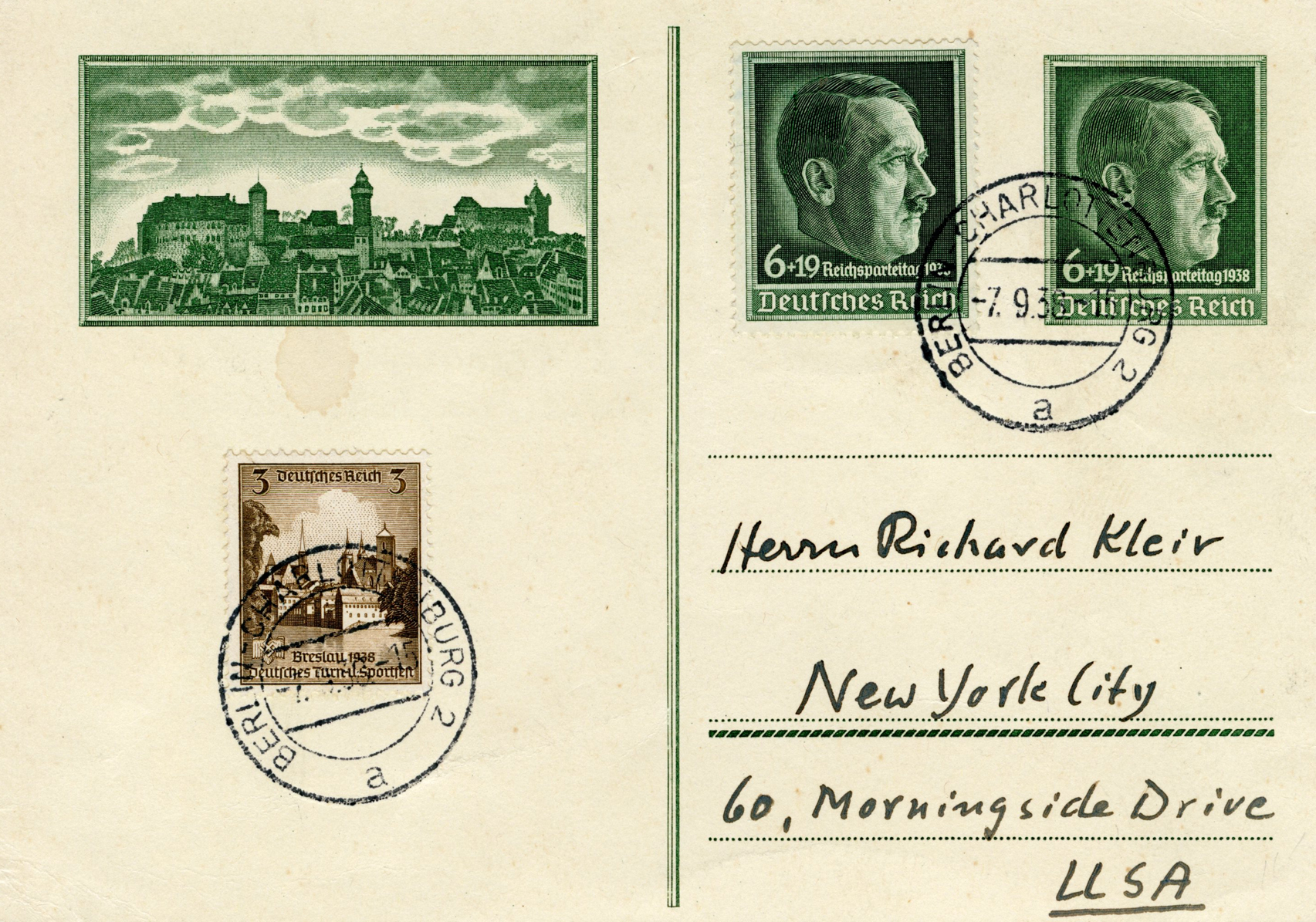 [Below: This postcard was postmarked on September 7, 1938 to New York City, from Berlin.]
