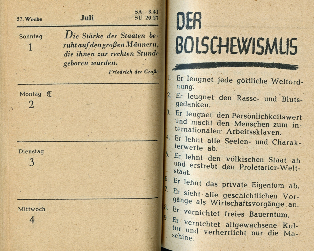 [Below: Front and reverse. This tiny book is called 'Wehrmacht Merkbuch 1945' (Wehrmacht Handbook 1945) published by 'Herausgegeben vom NS-Führungsstab der Wehrmacht' (Published by the NS Leadership Staff of the Wehrmacht). The reverse of the book reminds soldiers 'Schweigt und warnt jeden der schwatzt: pst!' (Be silent and warn everyone who chatters: shh!). This is a really neat book and tiny! It would fit in the palm of your hand. It was difficult to scan since the pages don't open wide, so I did my best to give you an idea of the material within. This book has a little bit of everything; a day planner, calendars, facts and information of all kinds. Click the image to see a lot more.]