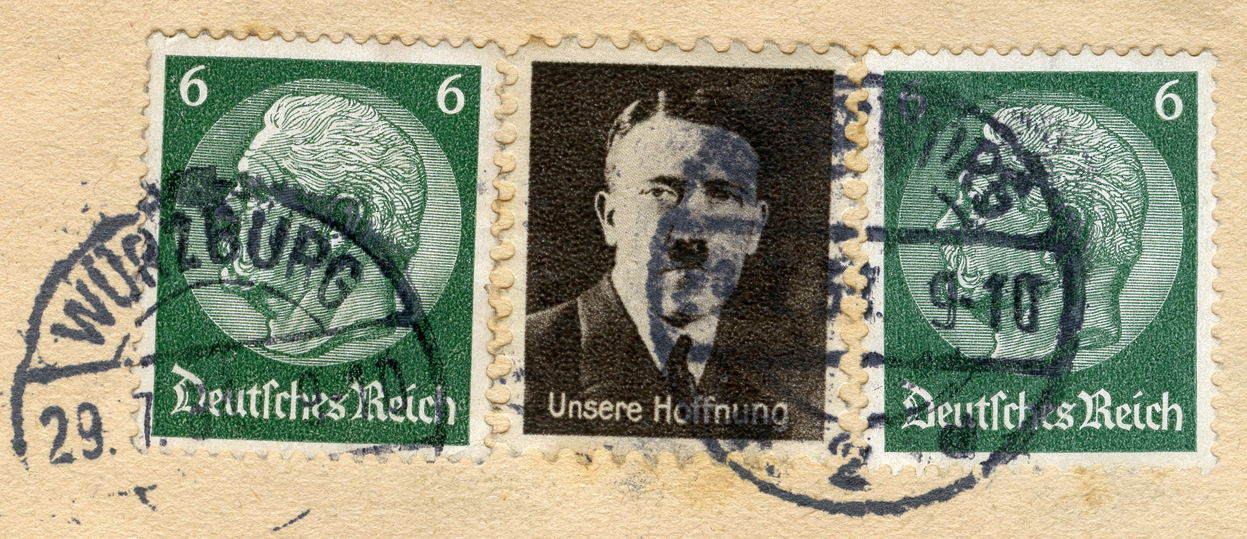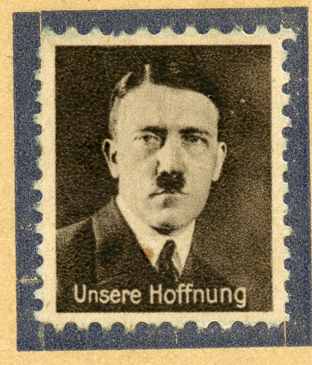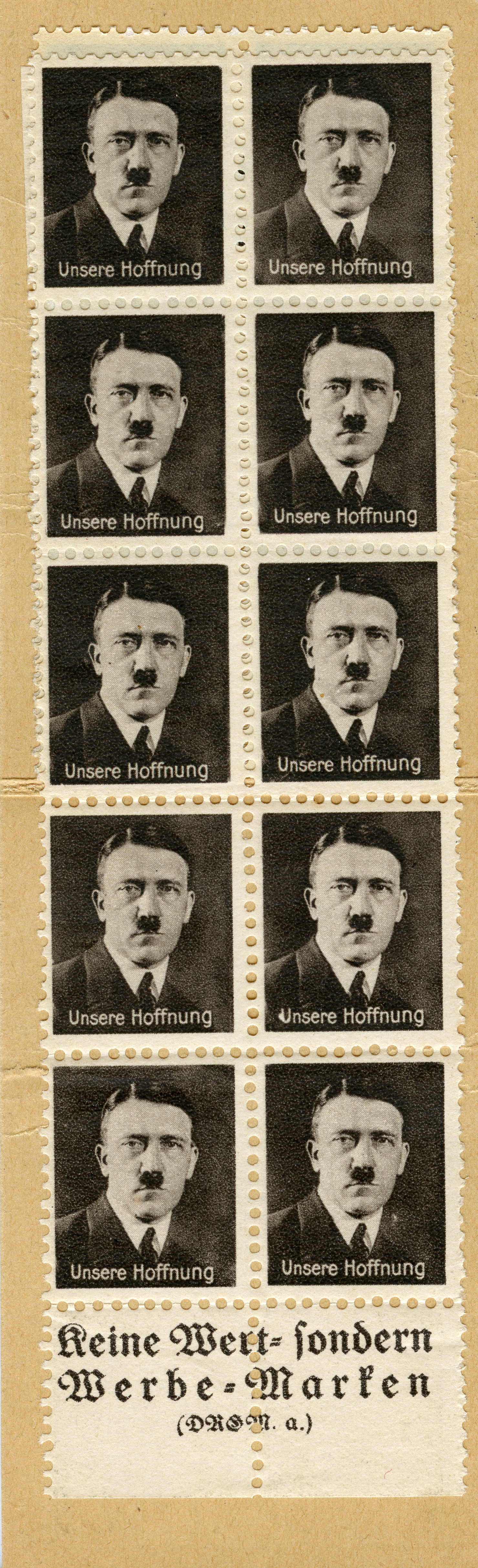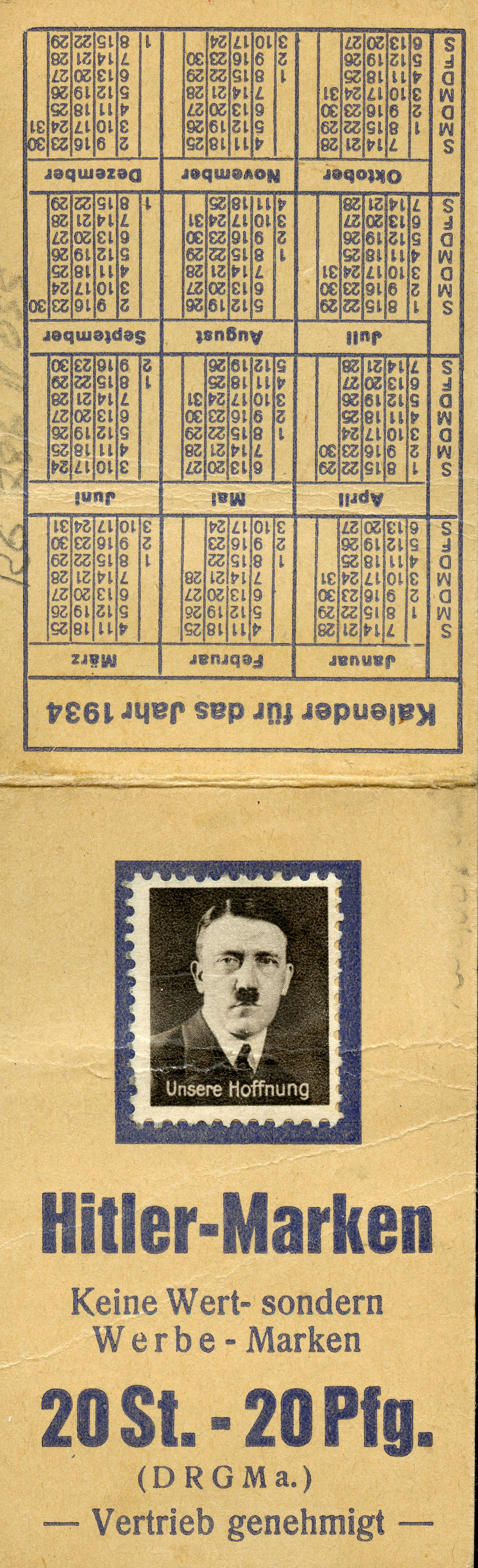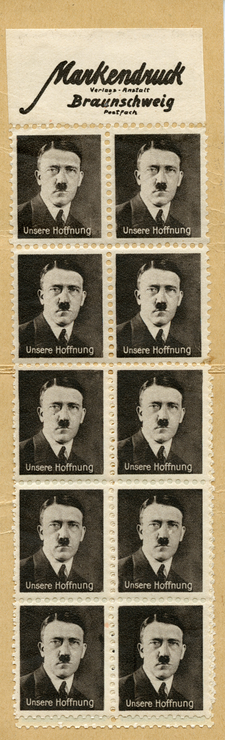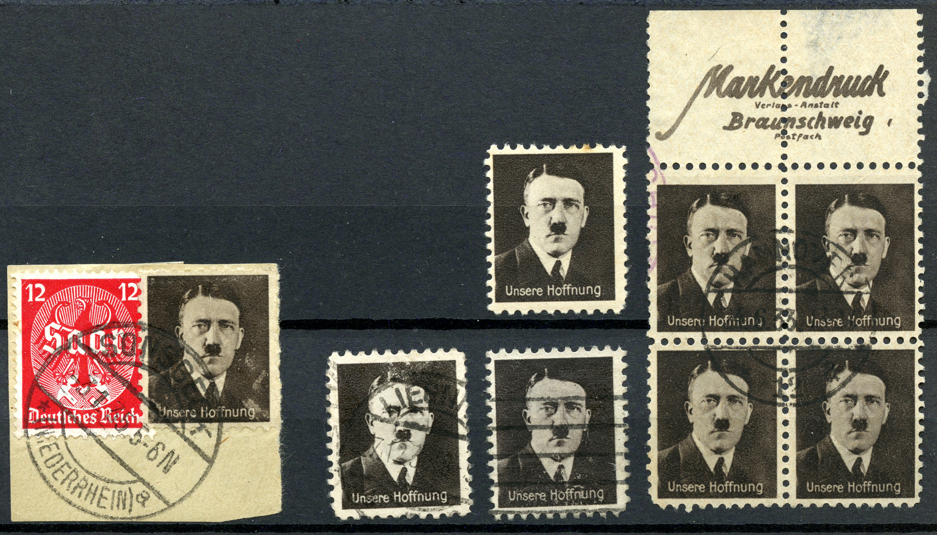 [Below: Here are two early NSDAP donation stamps depicting Adolf Hitler.]