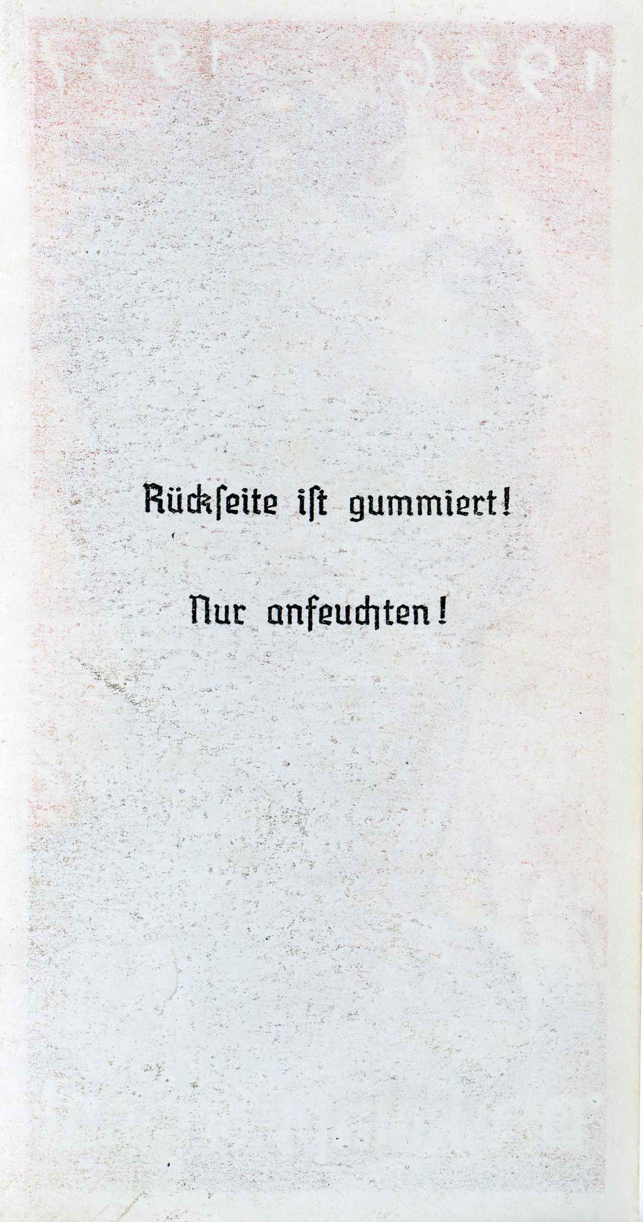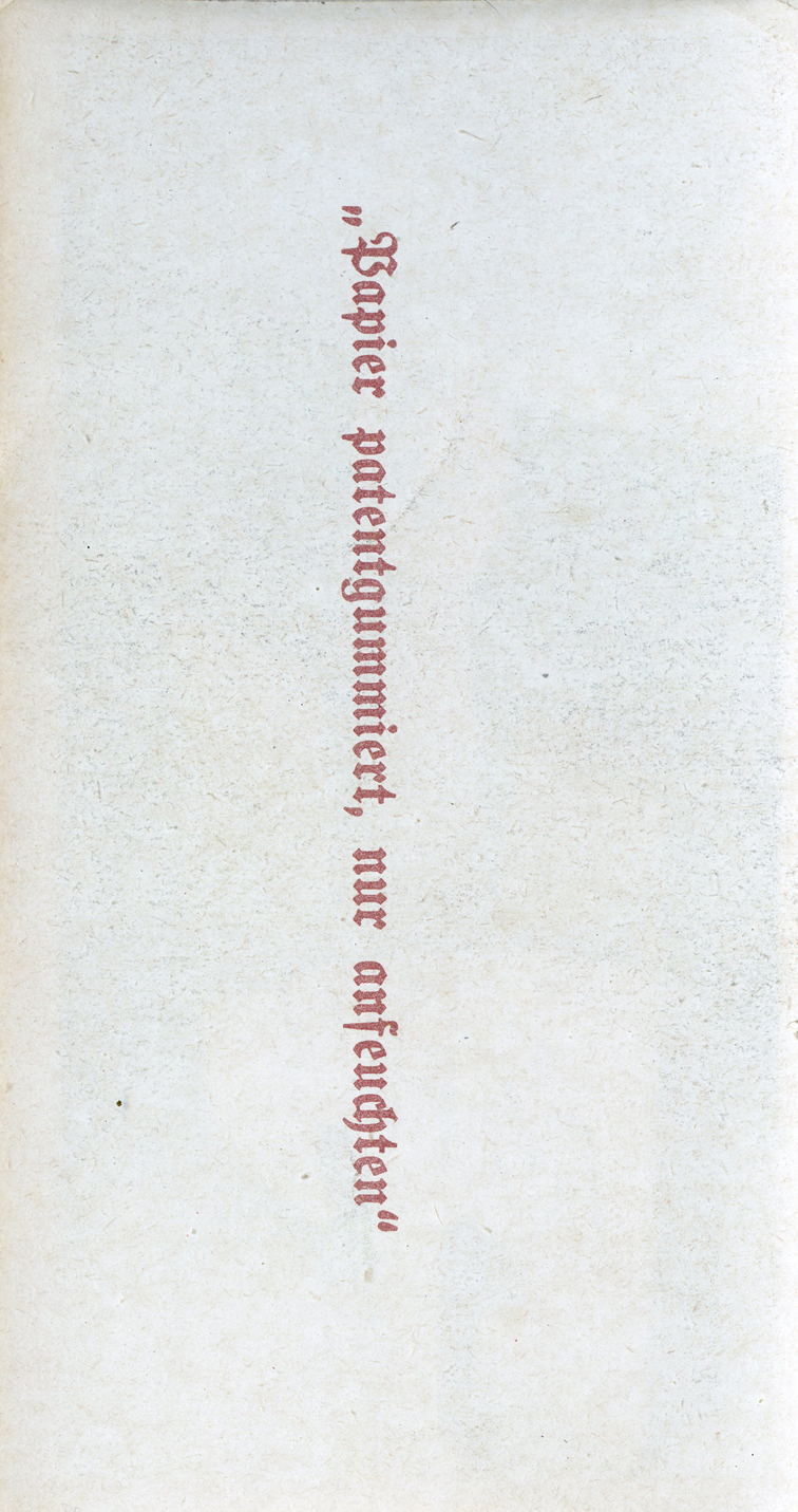 [Below: Reverse, this says 'Papier patentgummiert, nur anfeuchten' (Paper with a patented gum coating, just moisten).]