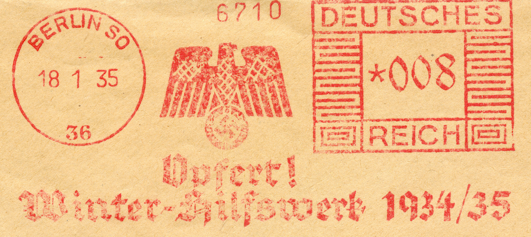 [Below: 1935 WHW meter mail from the Berlin WHW to the Berlin State Bank.]