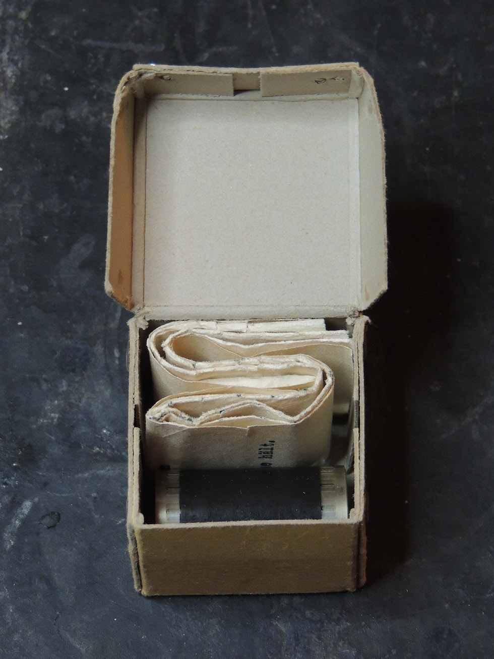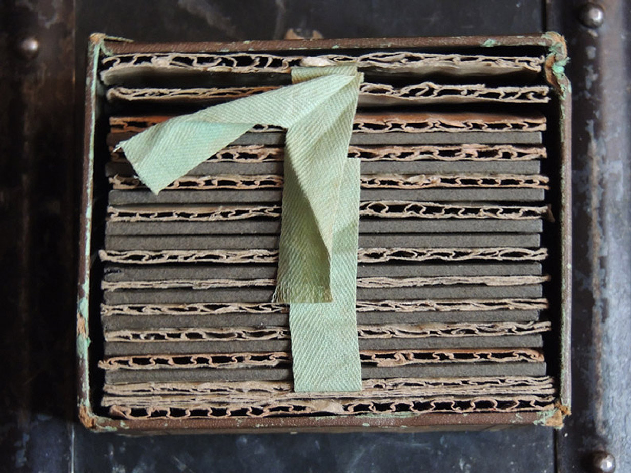 [Below: Here is the box viewed from above with the lid off. Those fabric strands are there to help pull out the slides.]