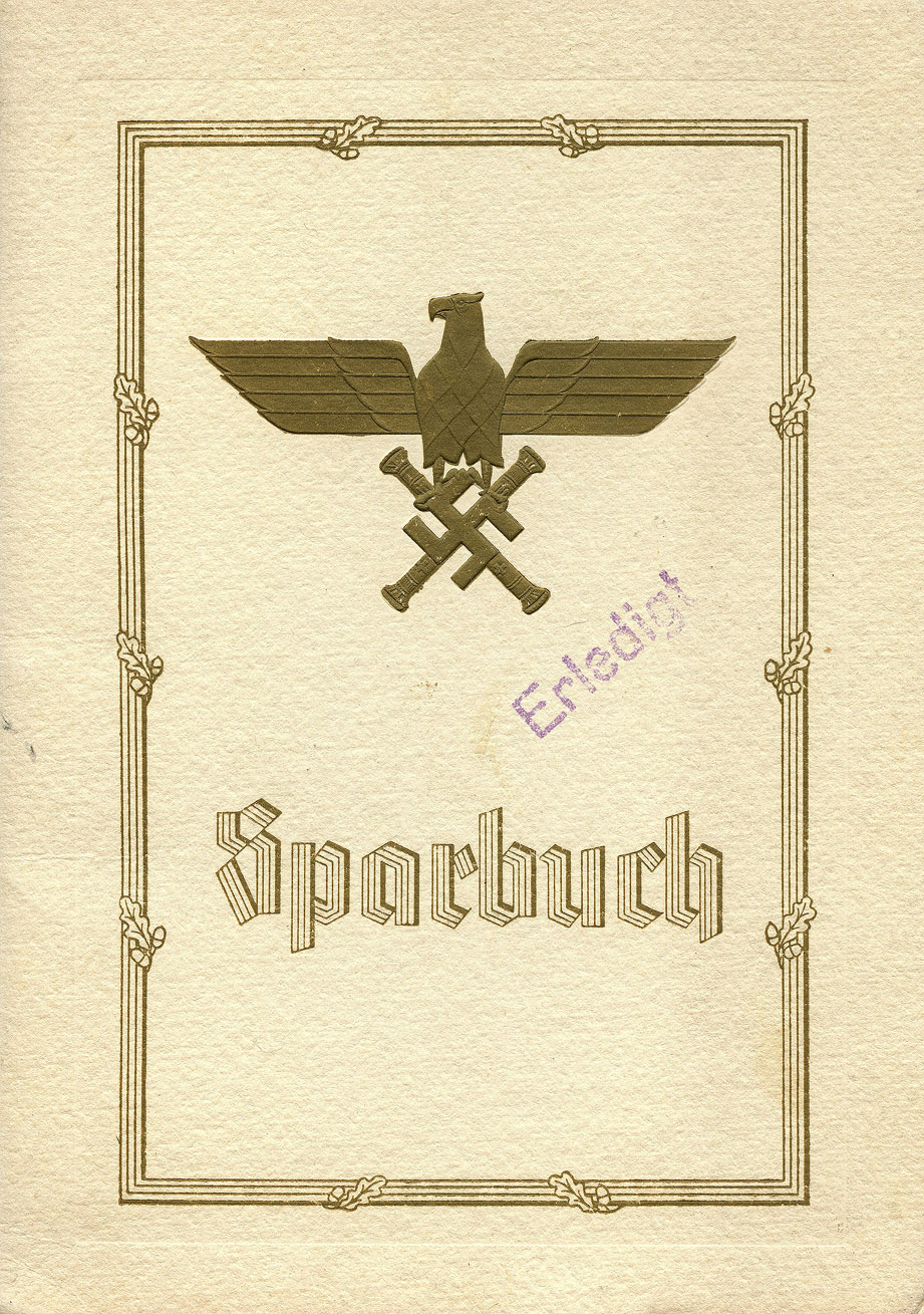 [Above: Wow, look at this! I've never seen anything like this before, so it must be very rare. It is a savings book from the Luftwaffe to a family of a KIA pilot. This was issued by Hermann Göring to a Hartmut Kühl, who was the son of the pilot killed in action. This magnificant quality book is 8½" by 6" with an embossed golden eagle with batons. This is Reichsmarshal Göring's personal symbol. The initial deposit was 1000 Reichsmarks in December 1942, with an additional deposit made by the family in 1945 in Erfurt. The ink stamp of 'Erledigt' means 'Completed'. Click on the image to see the pages within the book and pictures of the pilot!]