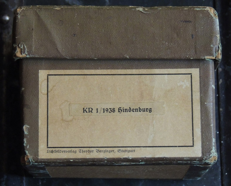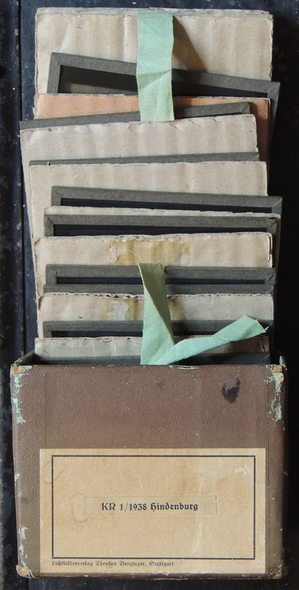 [Below: Here is a pretty unique find - a box of large glass slides from 1938. They are labeled 'KR 1/1938 hindenburg', but I'm not sure why it would say Hindenburg, since the slides do not involve the man or the airship. Perhaps these were at some school and they got mixed up with other slides? I'm unsure. Either way, the pictures are pretty cool and most of them seem to be either unpublished or very rare. Unforuntately there is no way to scan them into actual photos (that I know of). The slides themselves are very dirty and although I gently cleaned them they are still filled with debris. The slides are a lot larger than modern slides, measuring 3¼" x 4". The slides are also numbered and there is only a partial set (numbers 1, 2, 9, 10, 11, 12, 13, 14, 15 and 16). First, here is a picture of the box itself. Enjoy. Click to enlarge!]