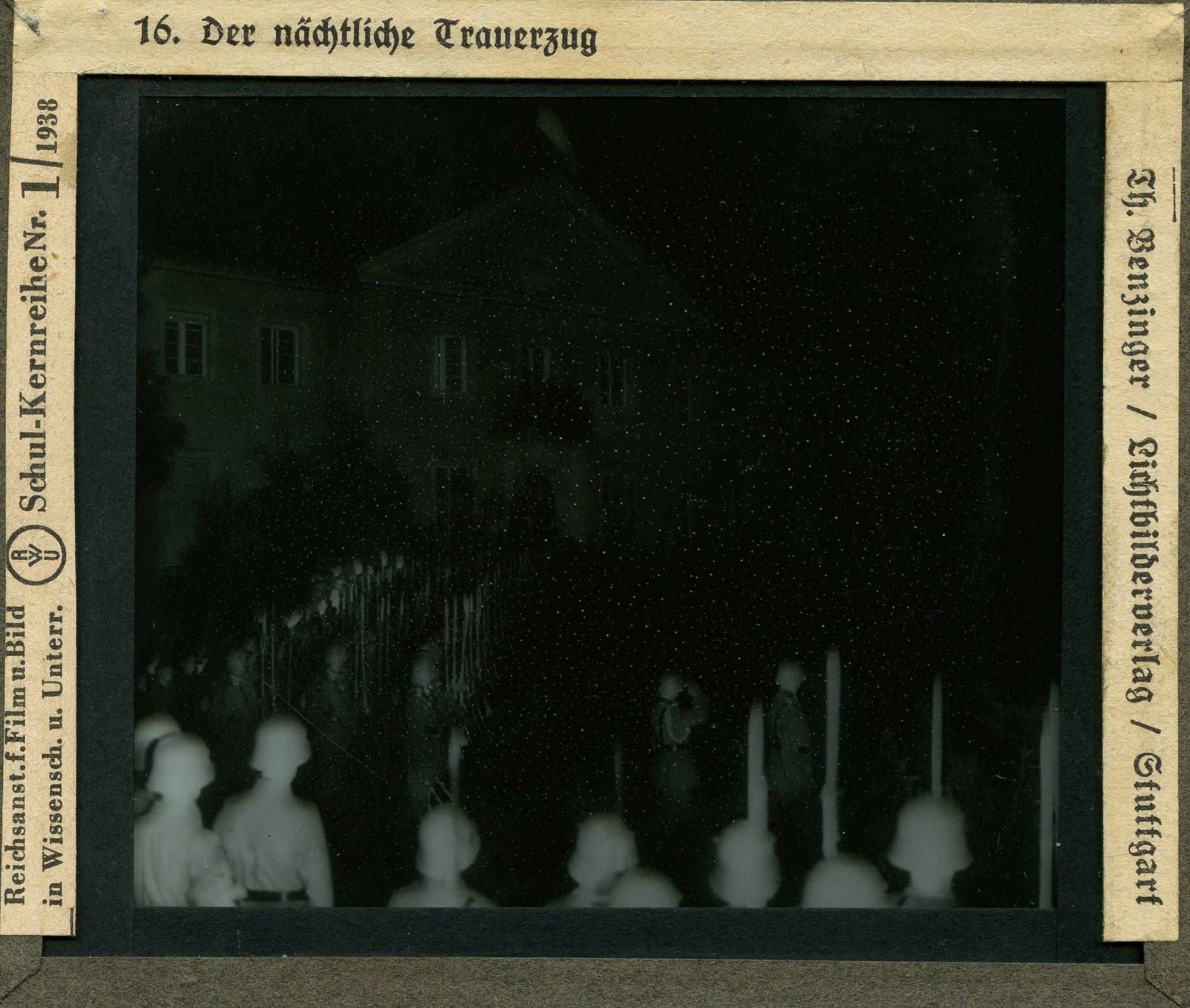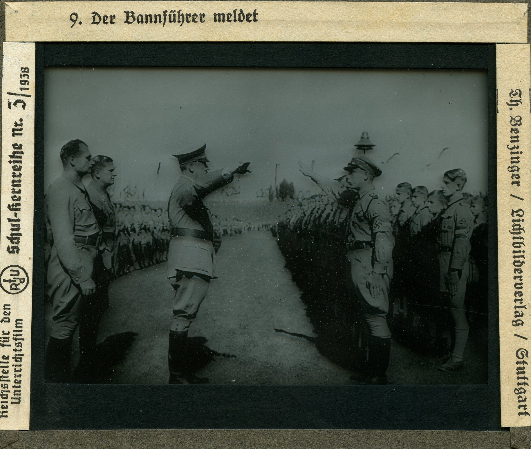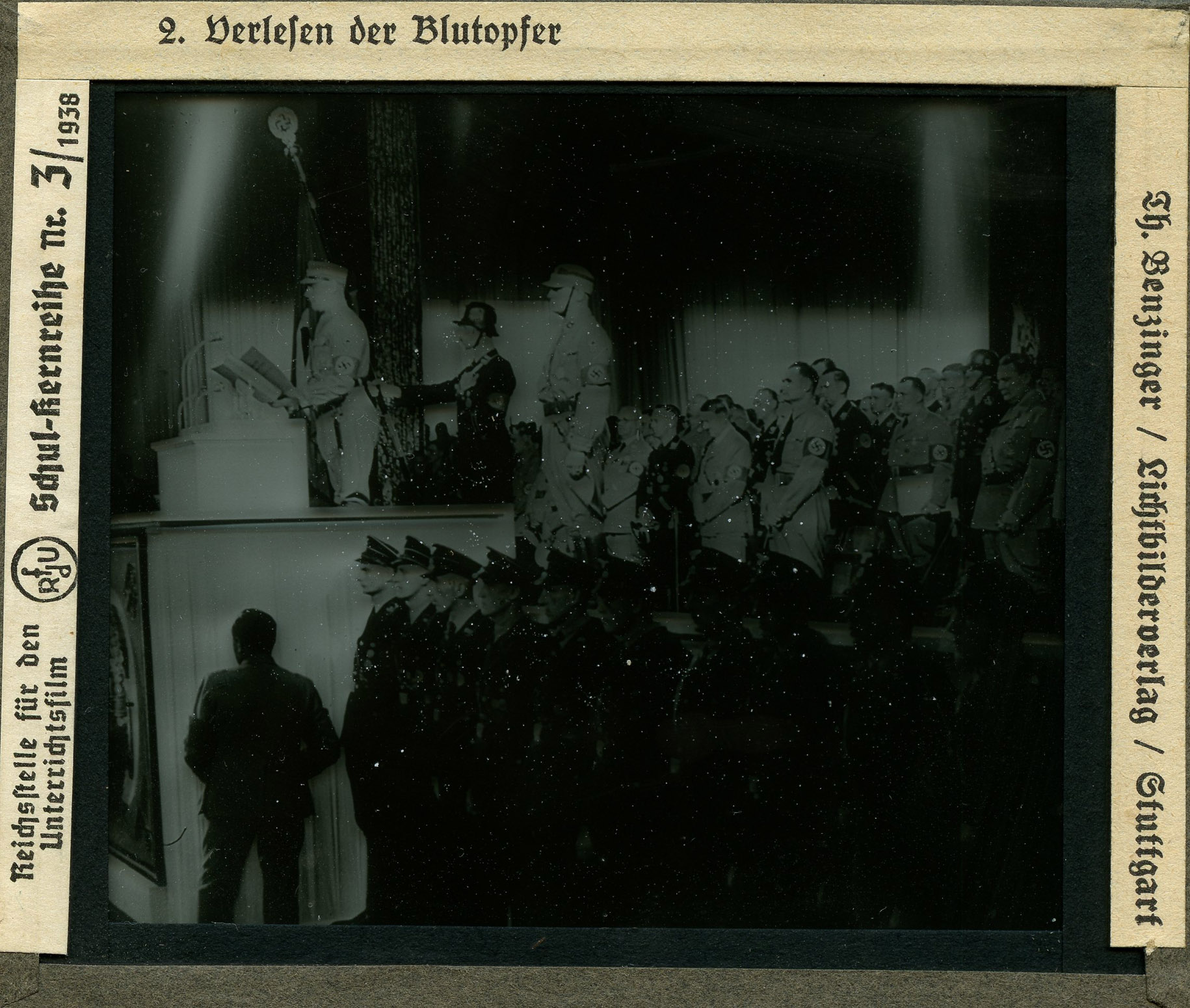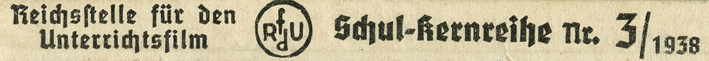 [Below: Each slide has two tabs of information on each side, first let's look at the left side. It says: 'Reichsstelle für den Unterrichtsfilm - Schul-kernreihe', which translates as 'Reich office for the educational film - School core series'. You'll also notice the strange circle with the letters 'RfdU' which stands for Reichsstelle für den Unterrichtsfilm.]