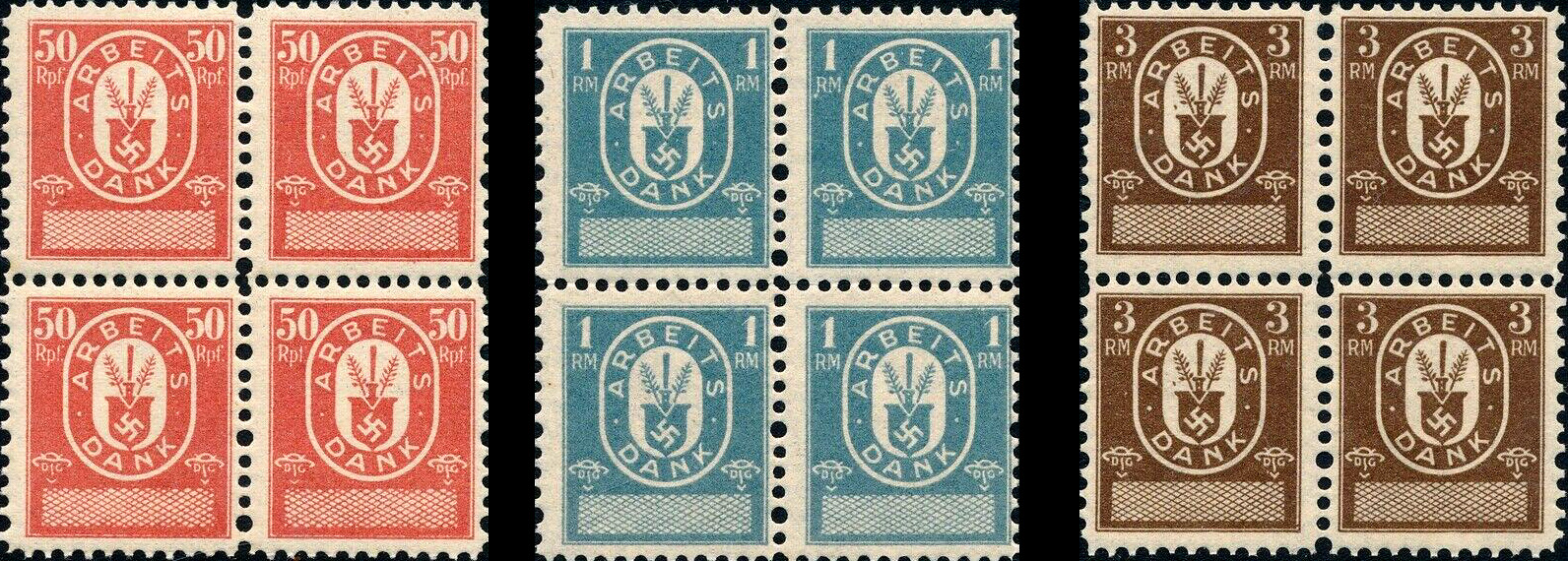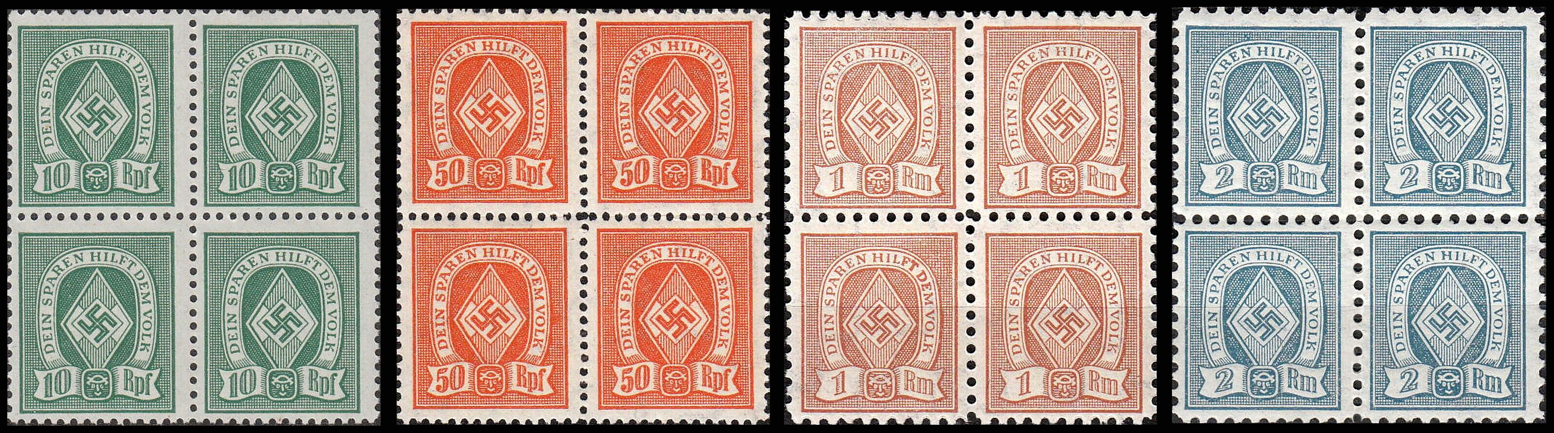 [Below: These are 'Kraft durch Freude Sparkassen' (Strength Through Joy Savings Banks) stamps, in a block of four.]