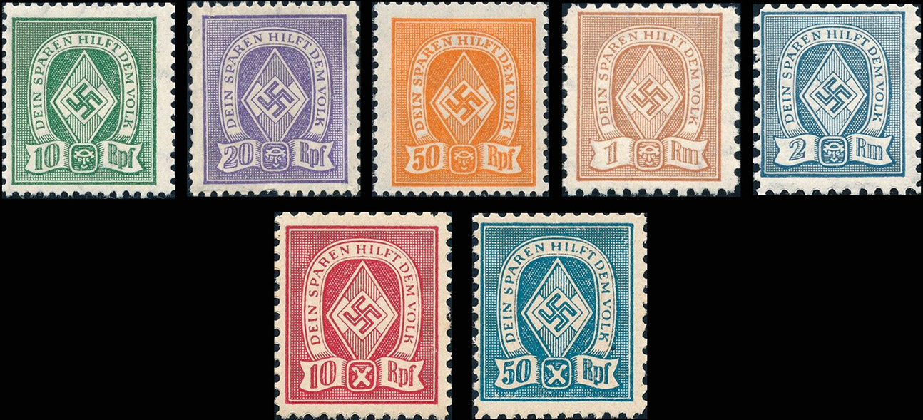 [Below: These are 'Kraft durch Freude Sparkassen' (Strength Through Joy Savings Banks) stamps.]