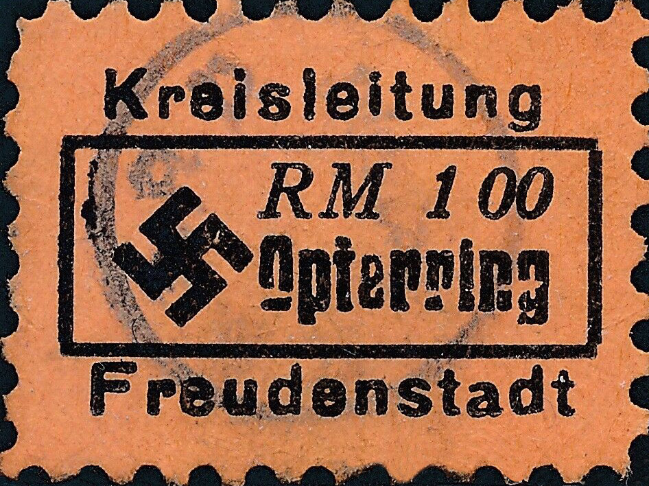 [Below: This dues stamp, from Freudenstadt, a town in Baden-Württemberg in southern Germany, says 'Kreisleitung' (District management).]