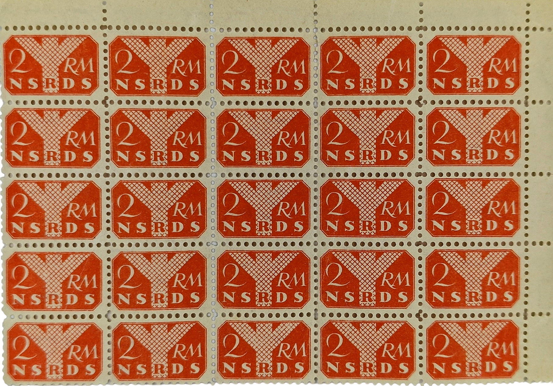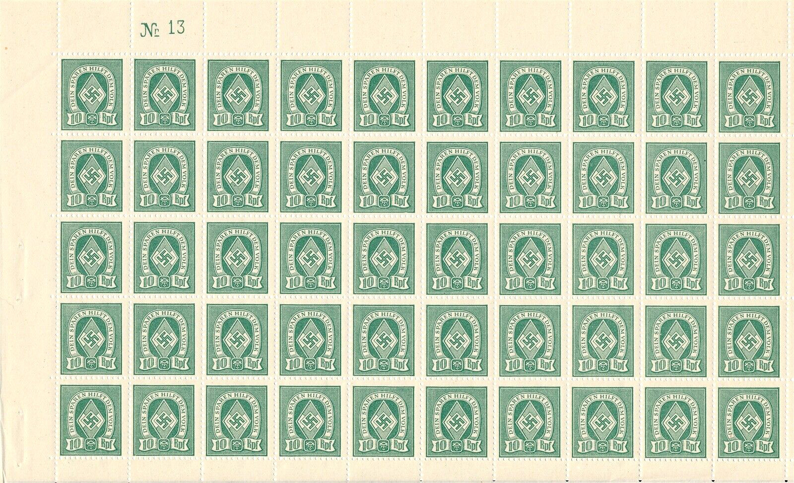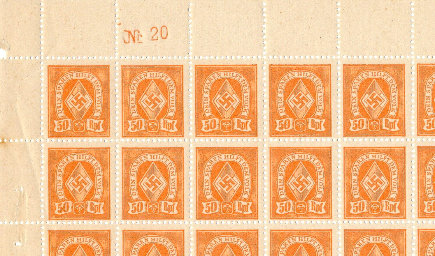 [Below: Very rare Hitler Youth savings stamps in sheets - 50 RPF (Reichspfennig).]