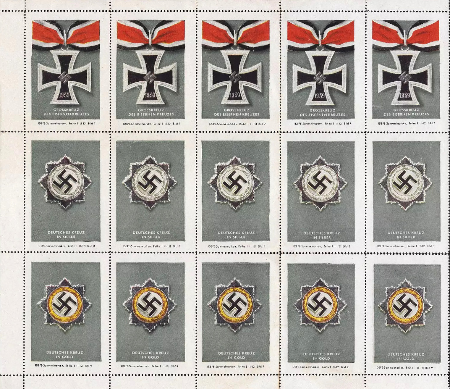 [Below: This is a rare partial sheet showing the Knight's Cross, German Cross in Silver and the German Cross in Gold. Click to enlarge.]