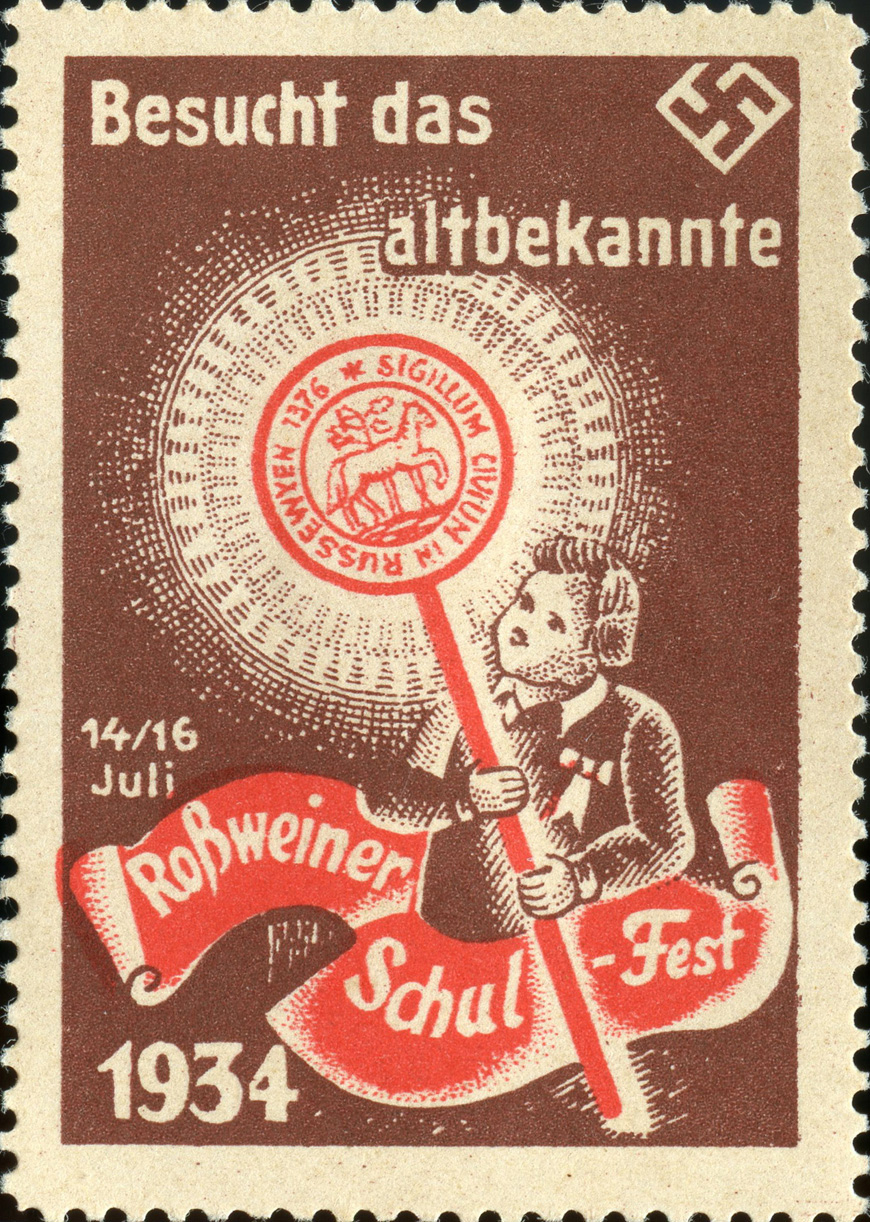 [Below: This is an advertising stamp, it says: 'Besucht das altbekannte Roßweiner Schul-Fest' (Visit the well-known Roßweiner School Festival).]