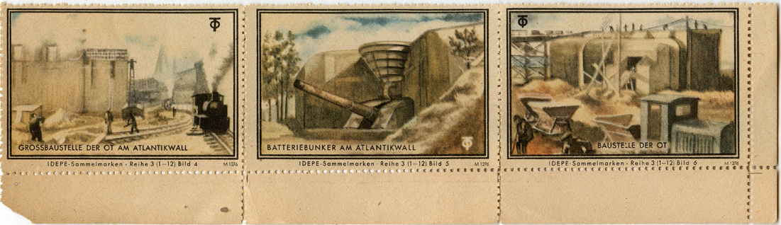 [Below: These advertising stamps are from the Organization Todt, showing the building of the Atlantic Wall.]