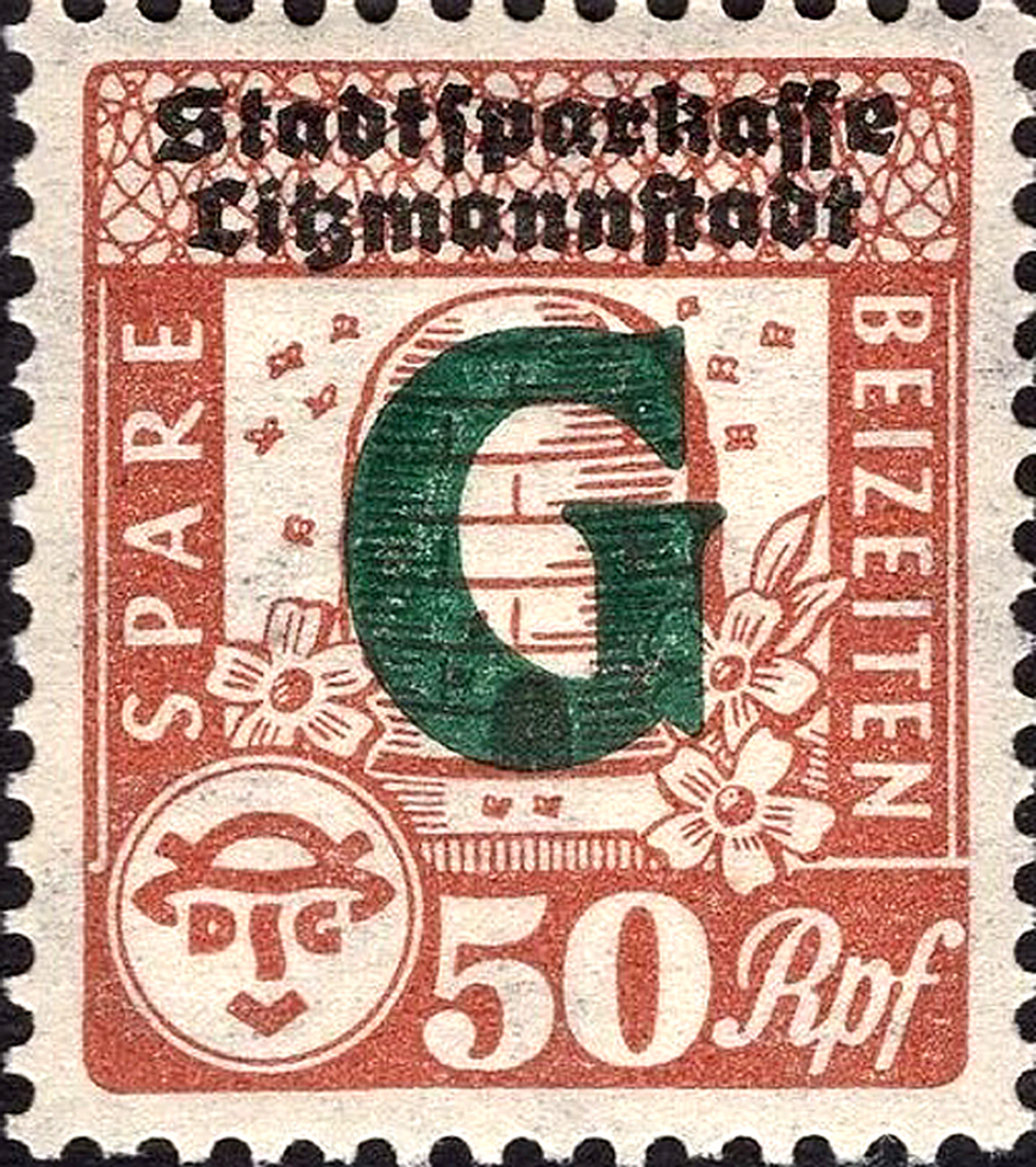 [Below: Another savings stamp, this says: 'Stadtsparkasse Litzmannstadt - Spare Beizeiten' (City Savings Bank Litzmannstadt - Save in Time).]