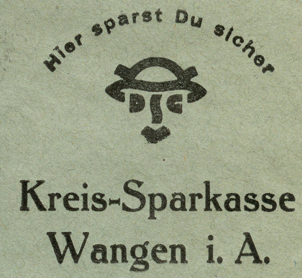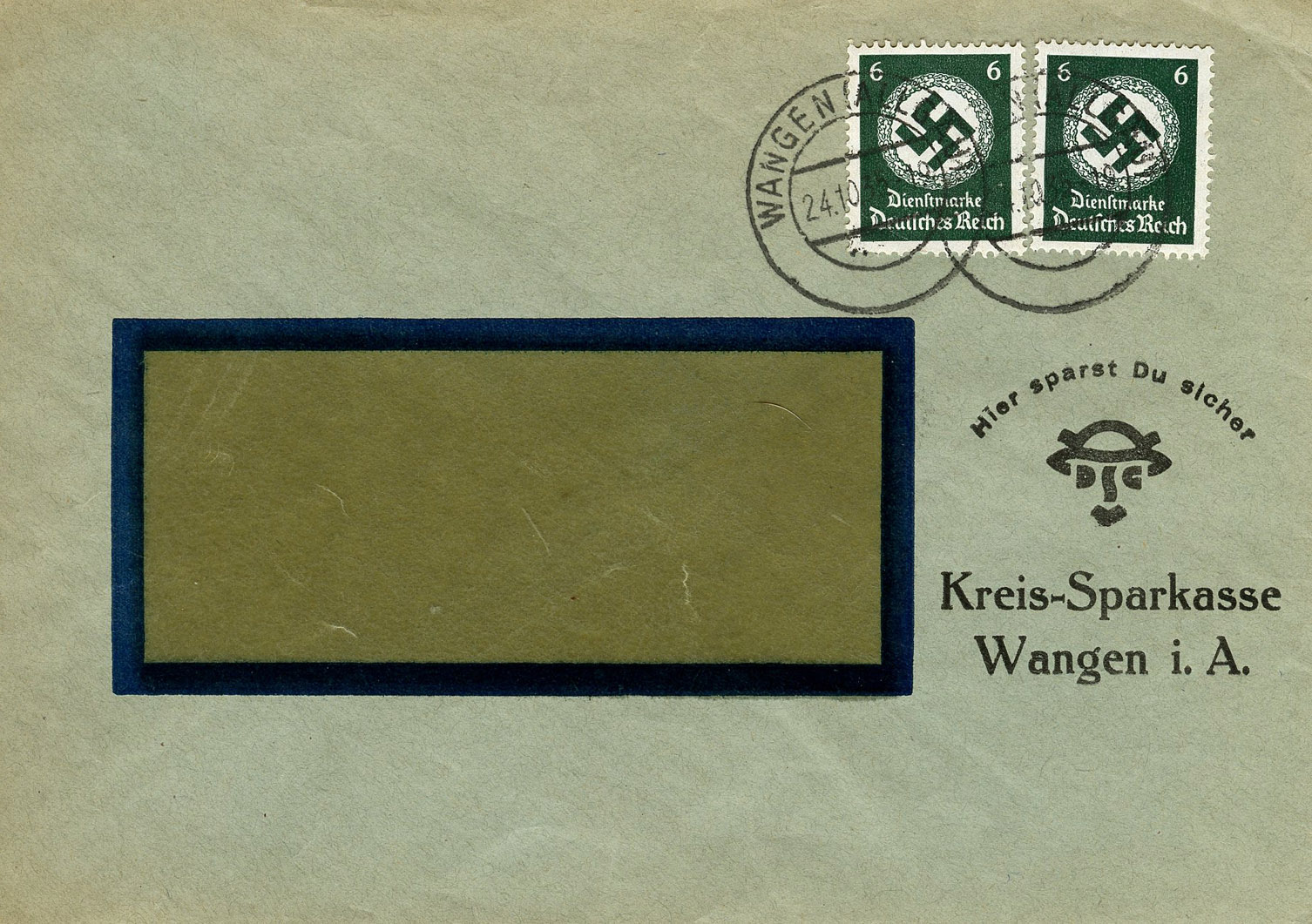[Below: This interesting official envelope says 'Hier sparst Du sicher' (You are sure to save here). This is from Wangen im Allgäu, a historic city in southeast Baden-Württemberg, Germany. This is from the 'Kreis-Sparkasse' (District Savings Bank) and was postmarked on October 24, 1935. The postage stamps seen here were for official use only. Let me explain the strange little face. Look closely at the face, from the left it says 'DSGV' which stands for 'Deutscher Sparkassen-und Giroverband' (German Savings Banks Association). Note that most of these stamps shown below have the little face]