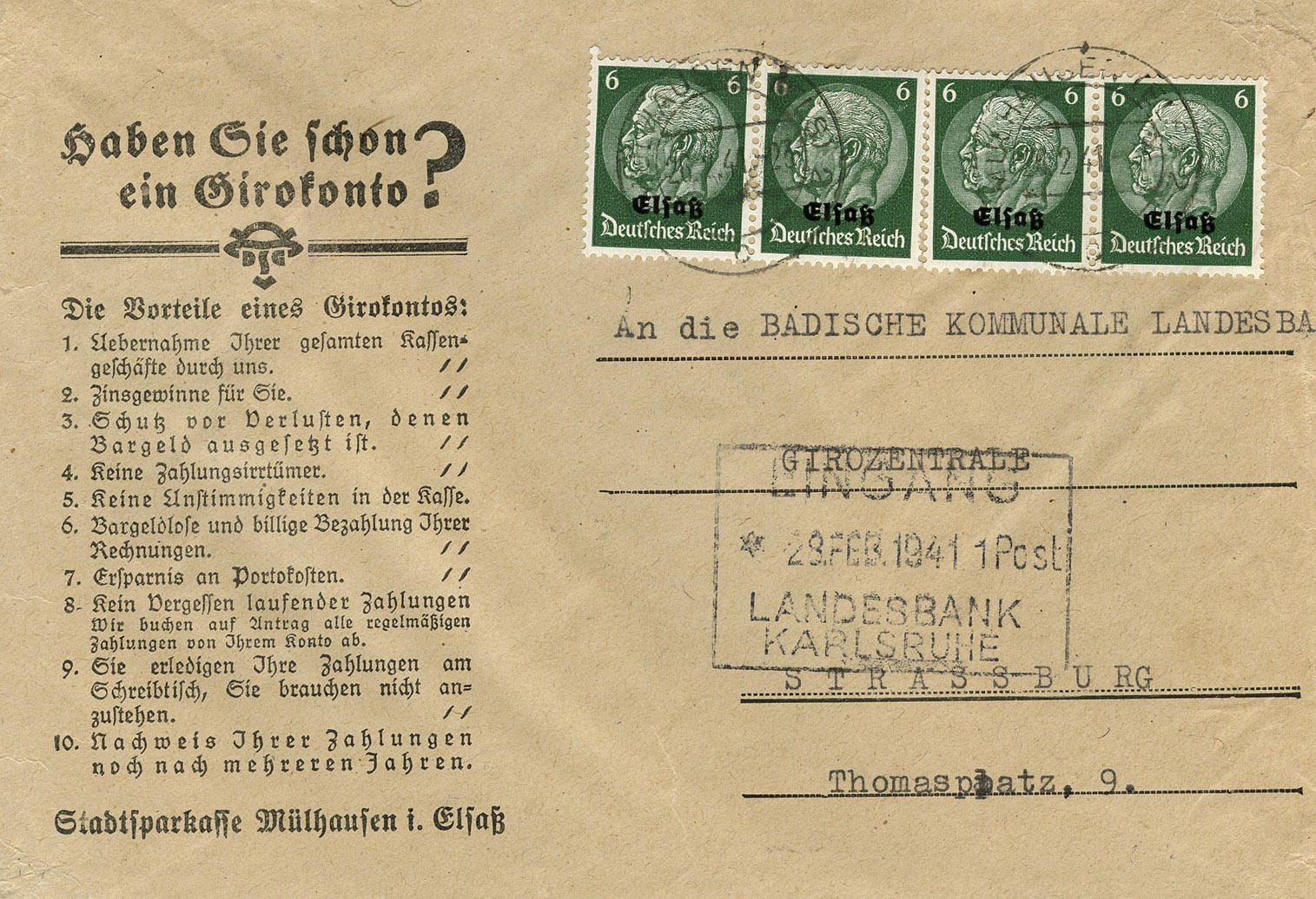 [Below: This says: 'Haben Sie schon ein Girokonto?' (Do you already have a current account?). You'll note that this uses four Hindenburg postage stamps, but they are overprinted 'Elsaß', this was for the Alsace–Lorraine area (Elsaß-Lothringen), a former German territory, recaptured by Germany during the war with France. There was also a set of postage stamps overprinted for Lothringen. This was postmarked on February 26, 1941.]