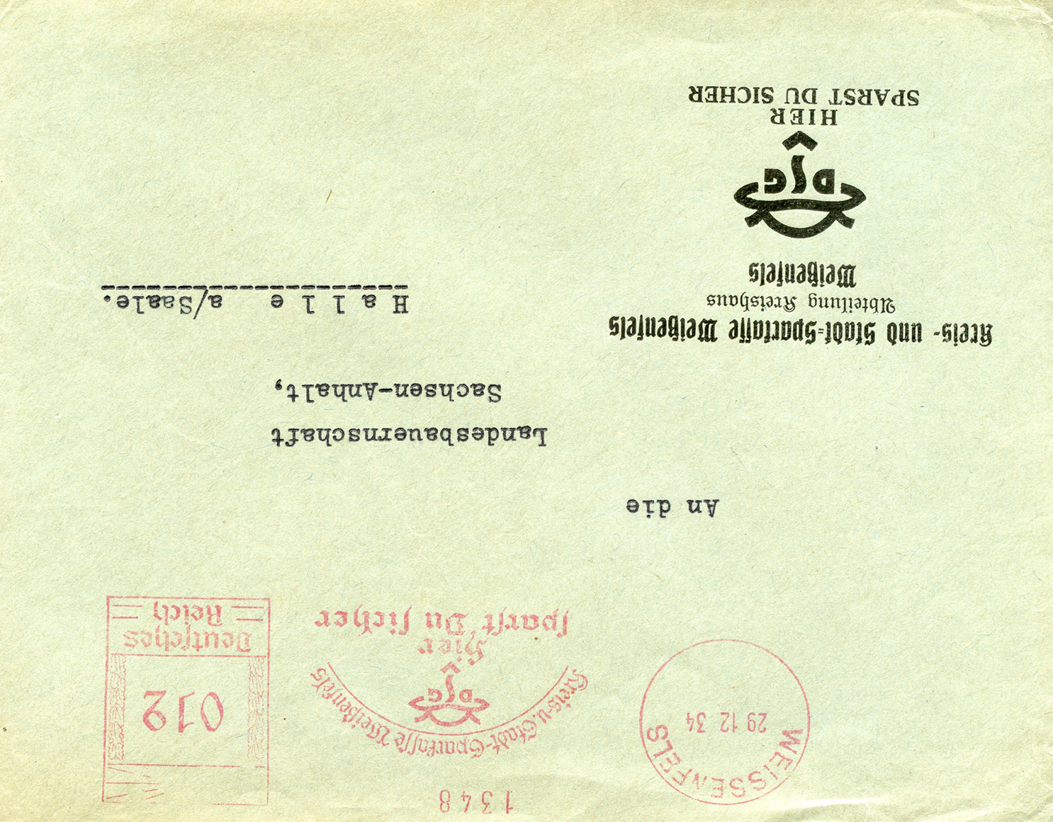[Below: This (metered mail) envelope is from Weißenfels, the largest town of the Burgenlandkreis district, in southern Saxony-Anhalt, central Germany. It was postmarked on December 29, 1934.]