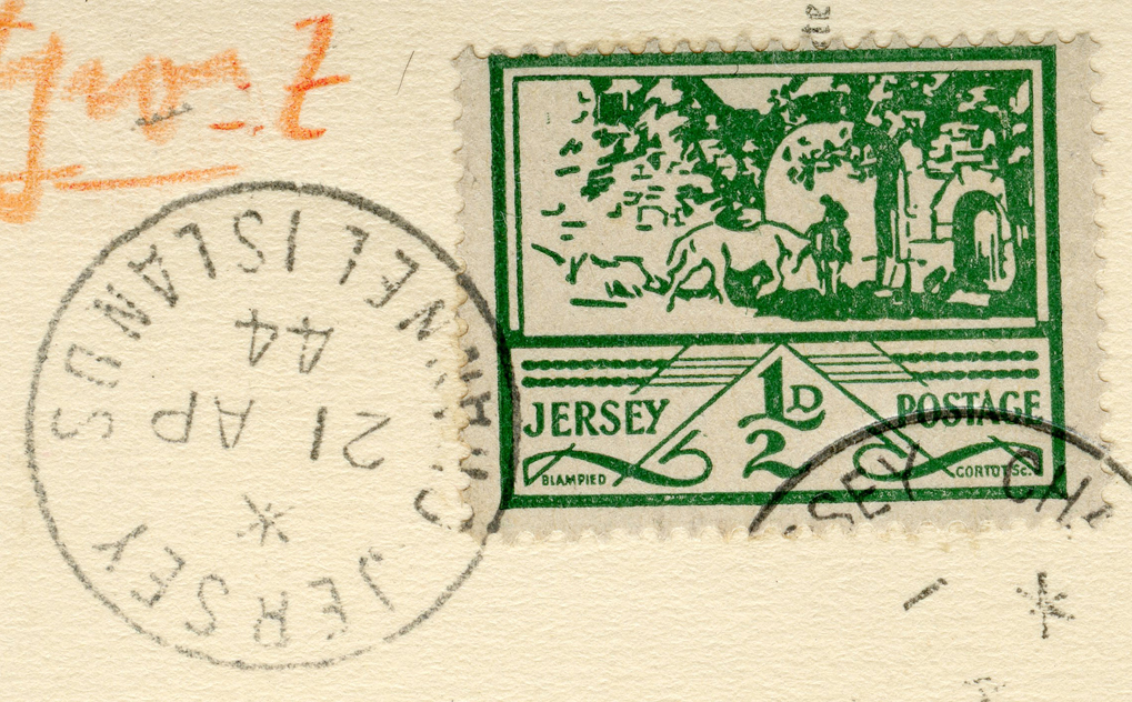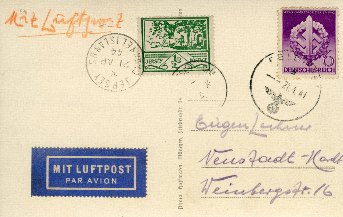 [Below: Reverse of postcard. This contains a German Reich postage stamp and an occupation of Jersey (Channel Islands) postage stamp. It also has a German Feldpost cancel, from April 21, 1944, and a Jersey cancel from the same date.]