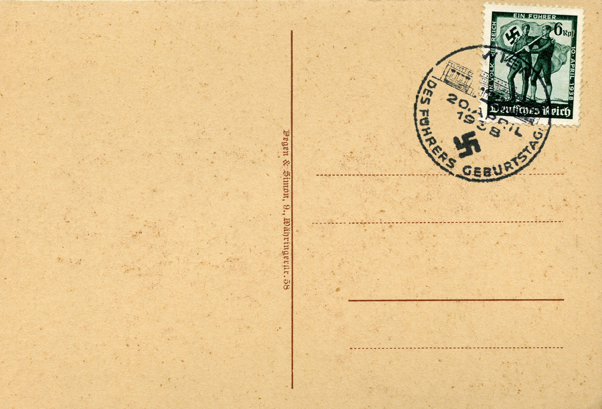 [Below: Postcard reverse. This has a Vienna cancel from Adolf Hitler's birthday - April 20, 1938.]