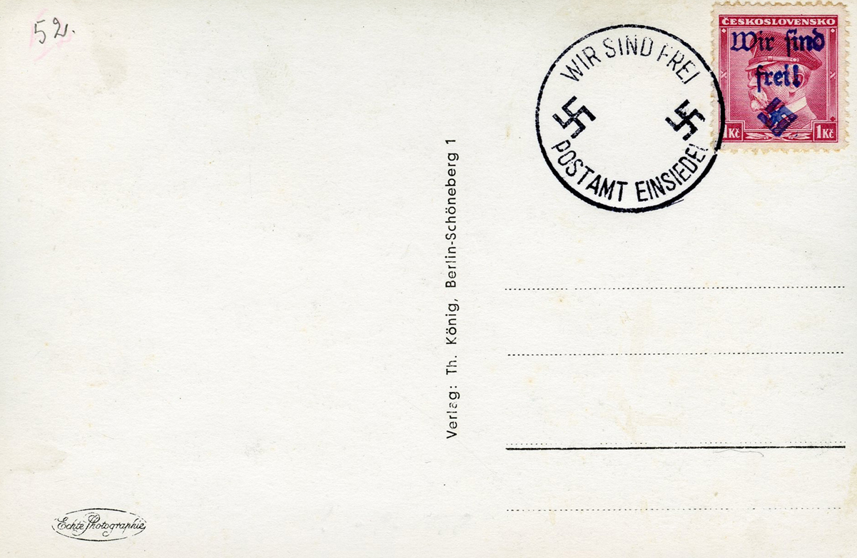 [Below: Postcard reverse. This has a special, locally overprinted, Sudetenland stamp, with the typical 'Wir Sind Frei!' (We Are Free!) overprint. The cancel is also a special Sudetenland variety.]