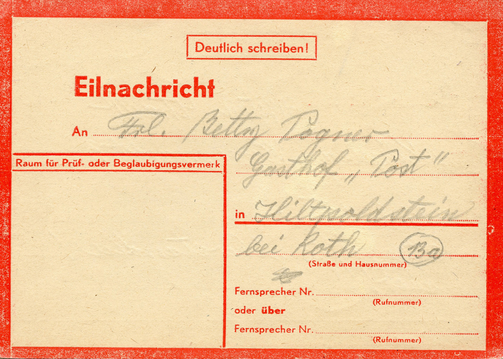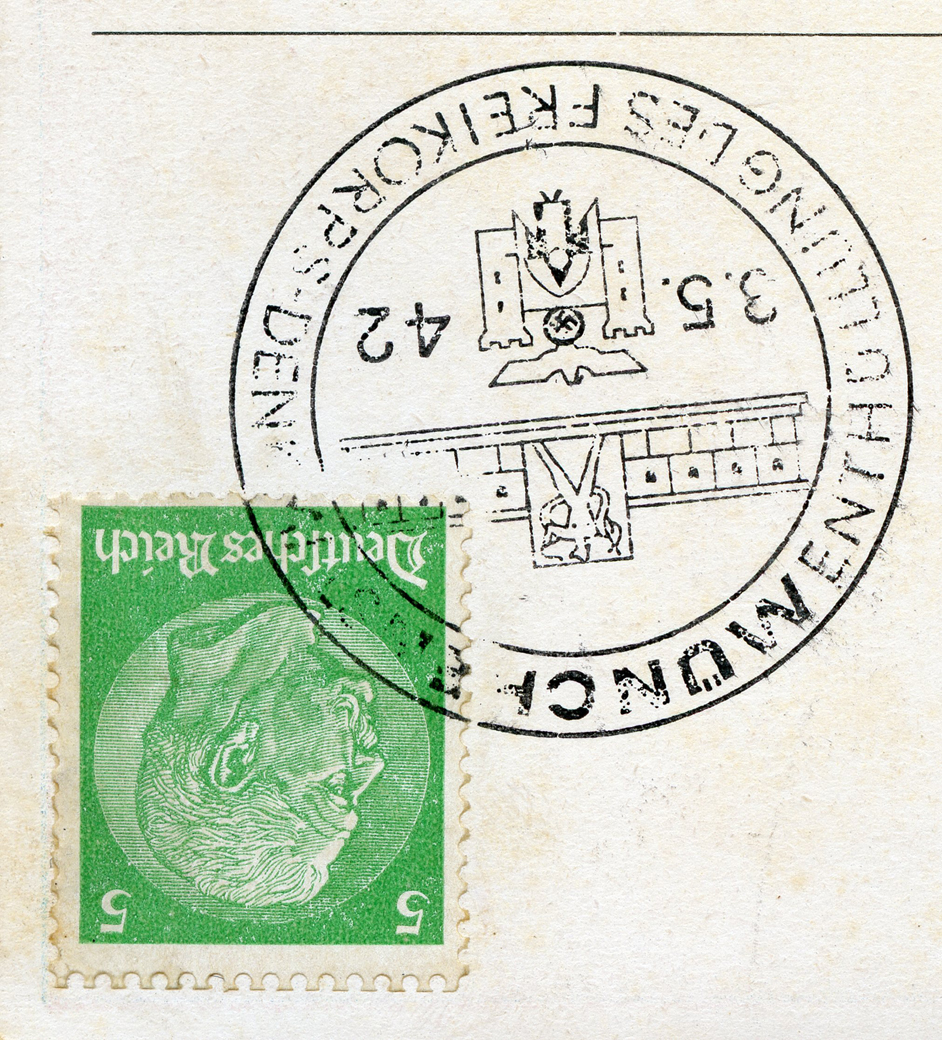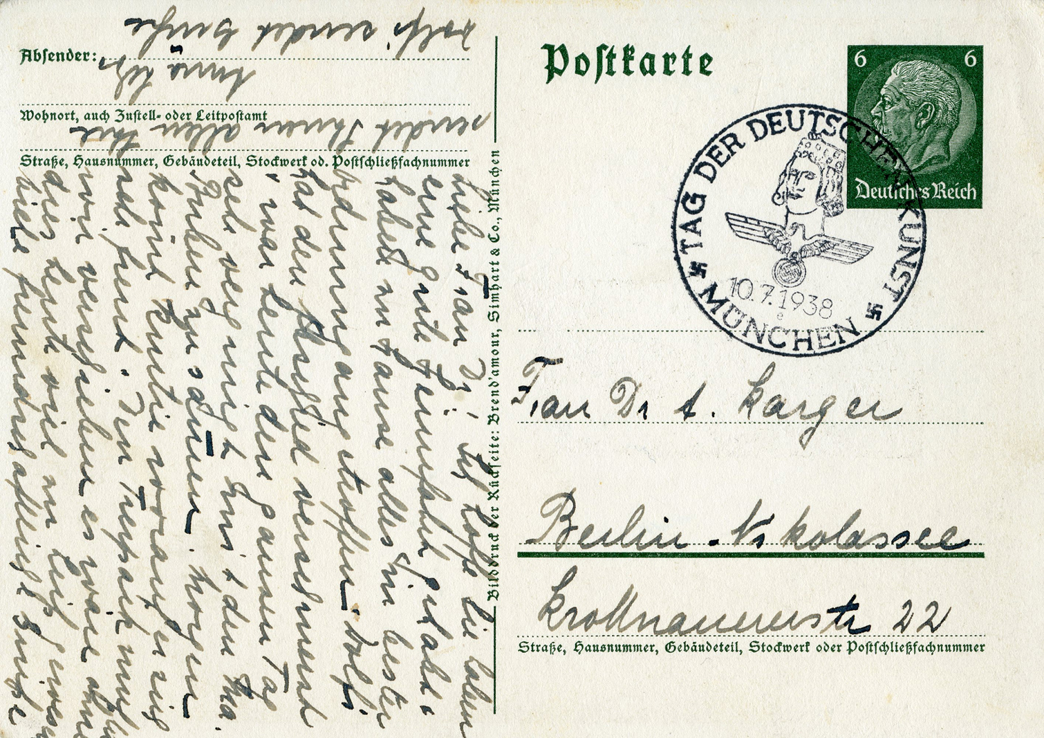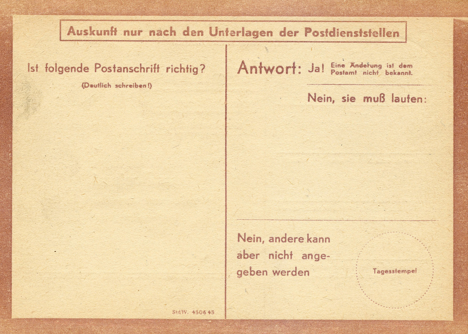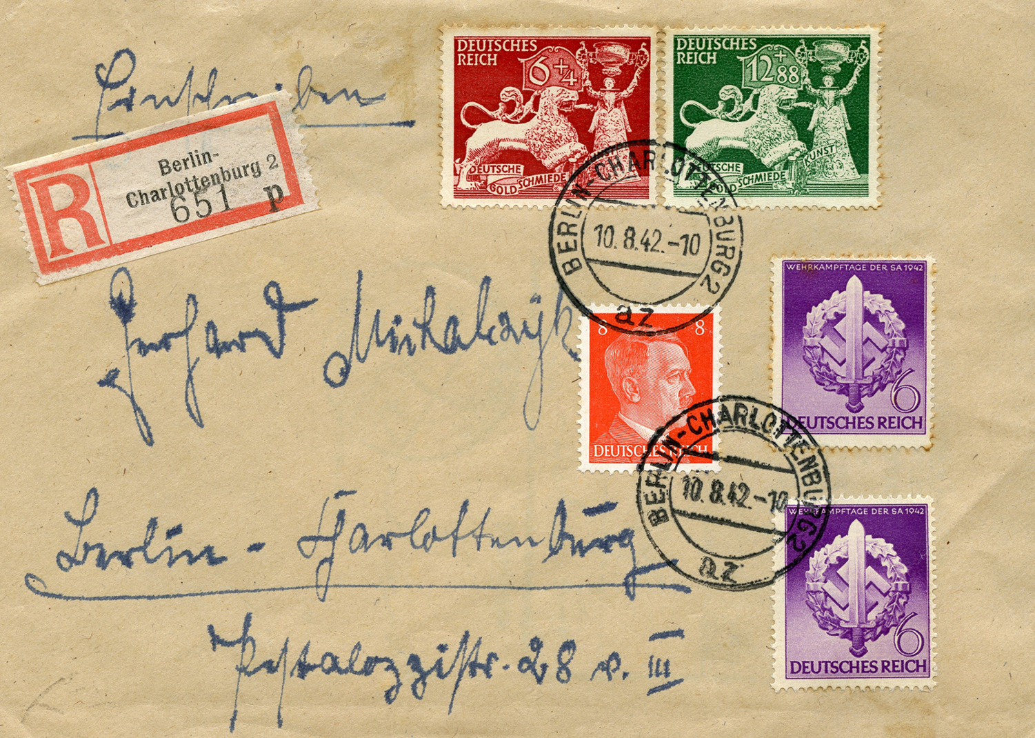[Below: Sent to a different address -- Adolf Hitler Street, with a different cancel as well.]