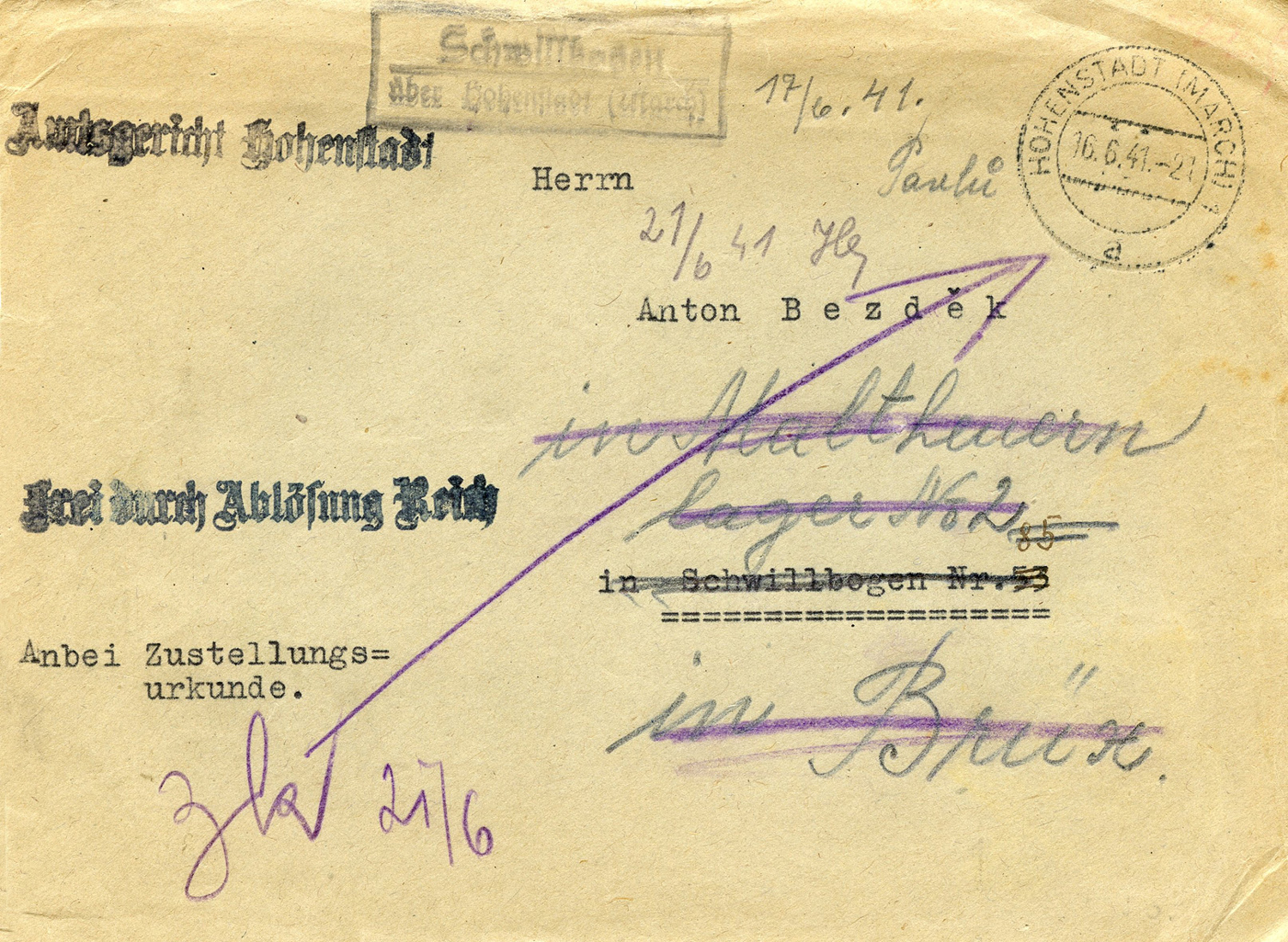 [Below: This is a government envelope from Württemberg sent June 16, 1941 from Hohenstadt (March). It was sent from 'Amtsgericht Hohenstadt' (Hohenstadt District Court) with a 'Anbei Zustellungs=urkunde' (enclosed certificate of delivery). You'll notice it lacks any postage stamps, note the words 'Frei durch Ablösung Reich' (free thoughout the Reich). It seems they had a problem sending it to the recipient and penciled in a lager (camp) address, but then crossed that out for whatever reason. Also note in the upper middle/right the numbers and a name and initials, these are receival dates and the names of postal employees. You'll also see a big arrow with the letters beneath it in the lower left hand corner. It looks like 'ZK', this could stand for 'zurück', meaning 'return', since they couldn't find the addressee. Now let's look at the reverse...]