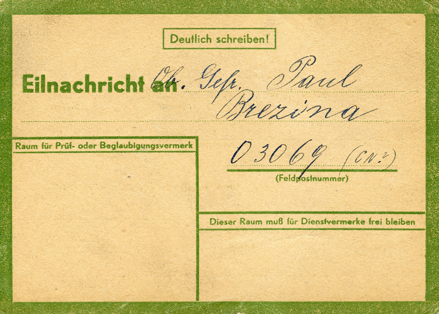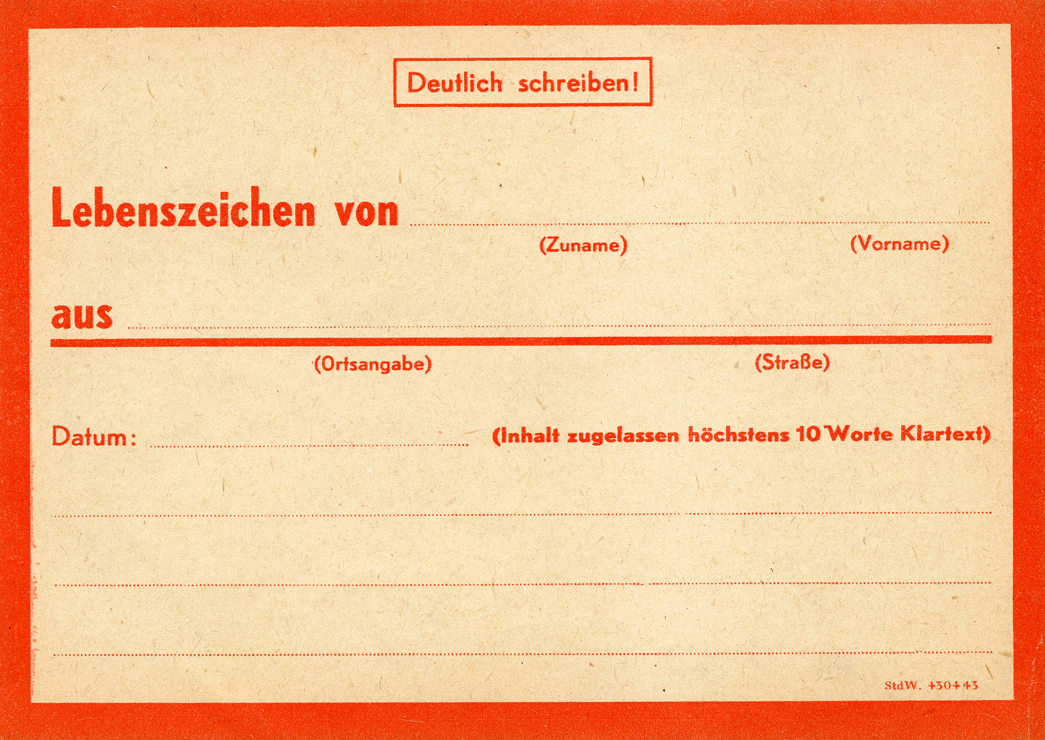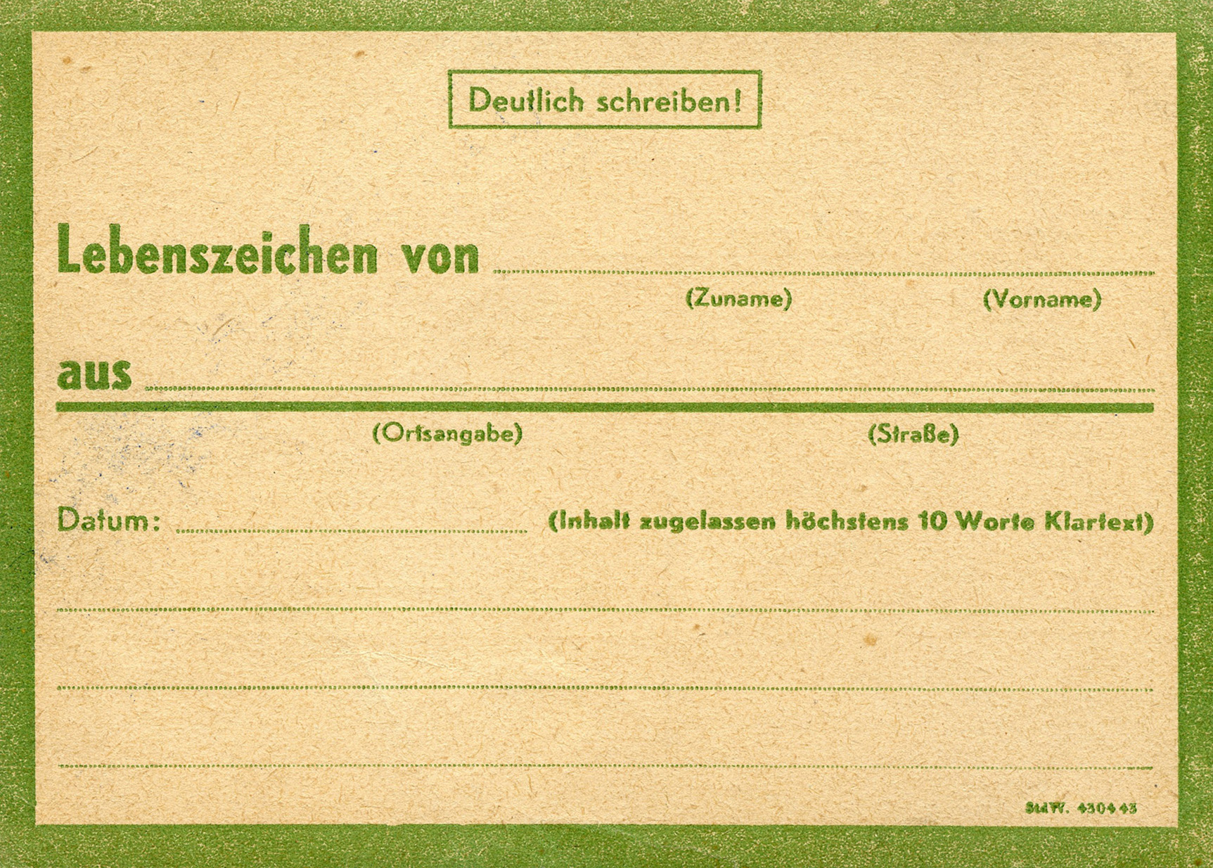 [Below: This postcard's text is the same as the green postcard above, minus the spot to write a Feldpost number.]