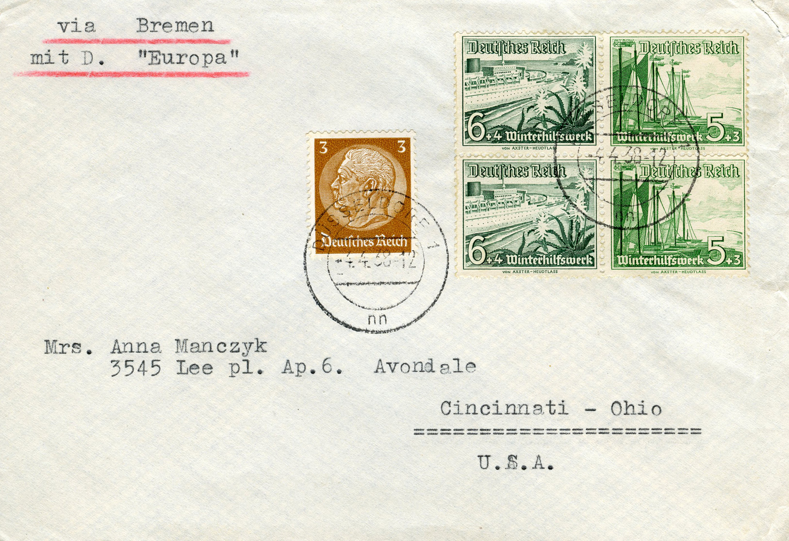 [Below: This has a block of se-tenant stamps, like the pair used above, canceled on April 4, 1938. This was sent to the USA, via a port in Bremen, on the German ocean liner the SS Europa, a beloved passenger ship known for its sleek design and speed. The reverse is blank.]