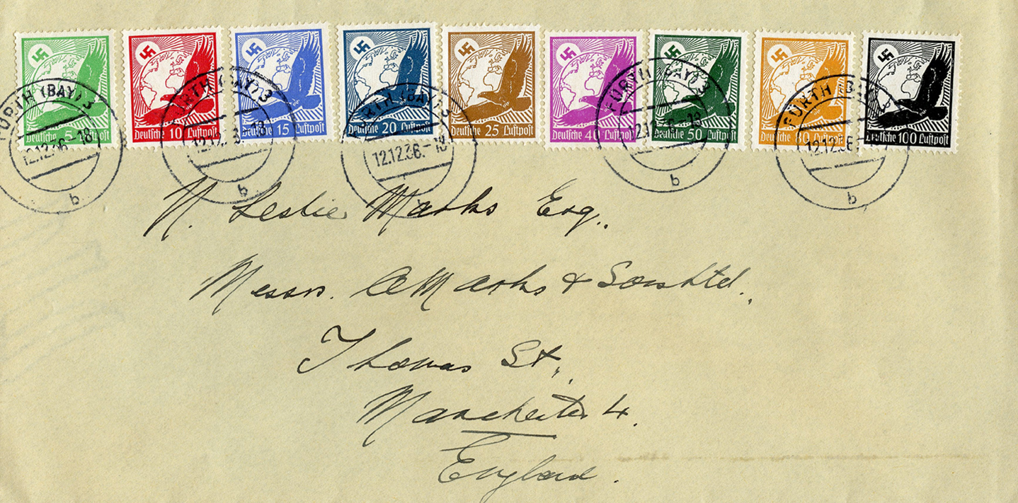 [Below: This has every single German airmail postage stamp, obviously done by a collector, sent on December 12, 1936 from Fürth (Bavaria), to Manchester England.]