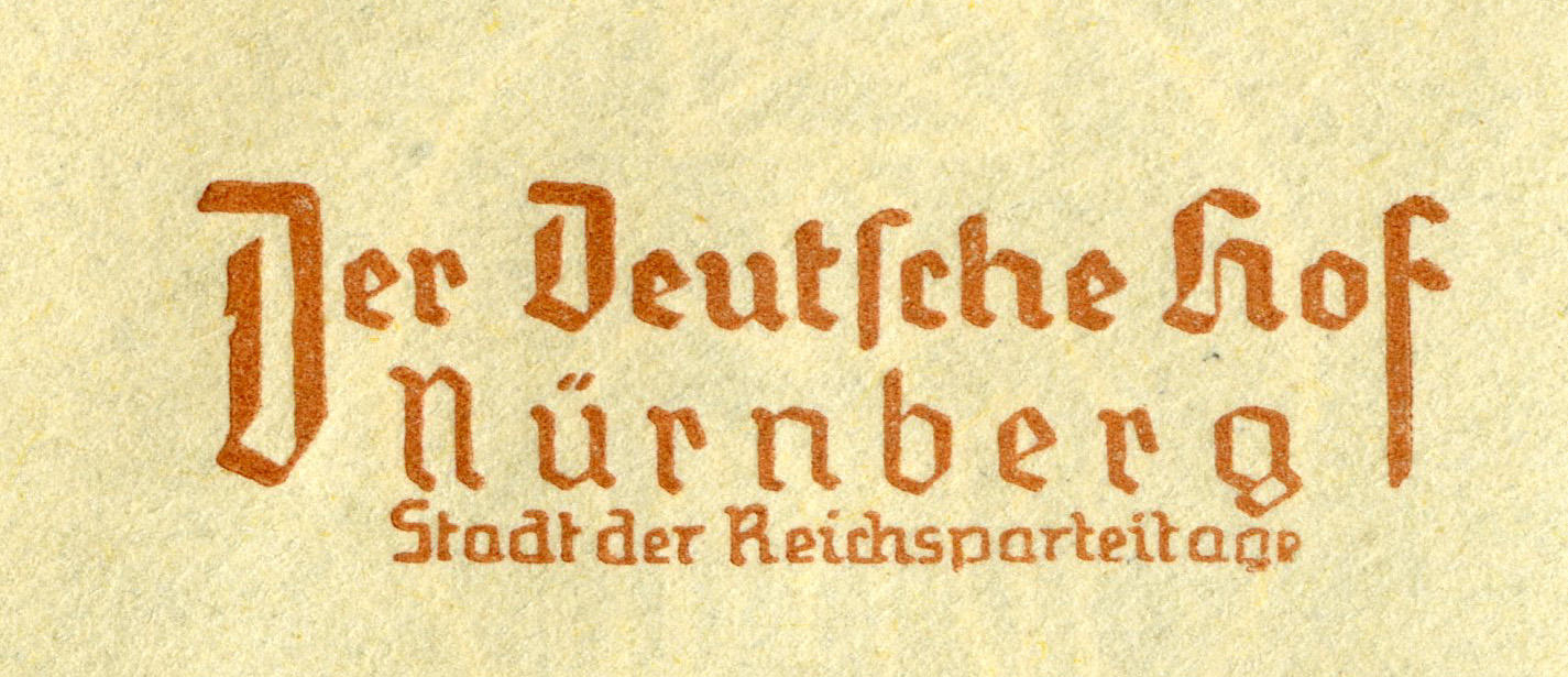 [Below: Reverse. This is from the 'Der Deutsche Hof' in Nuremberg and proclaims it is the state of the Reich Party Day. The Deutsche Hof was a special hotel where Adolf Hitler would stay during his time in the city, a practice that began in the earliest days of the Party. The period advertisements boasted the hotel was 'das Haus des Führers in Nürnberg' (The House of the Führer in Nuremberg). There are also a number of photographs showing Adolf Hitler reviewing his troops from the front of the hotel. Lastly, even the hotel's own silver service pieces were marked with a swastika and wreath.]