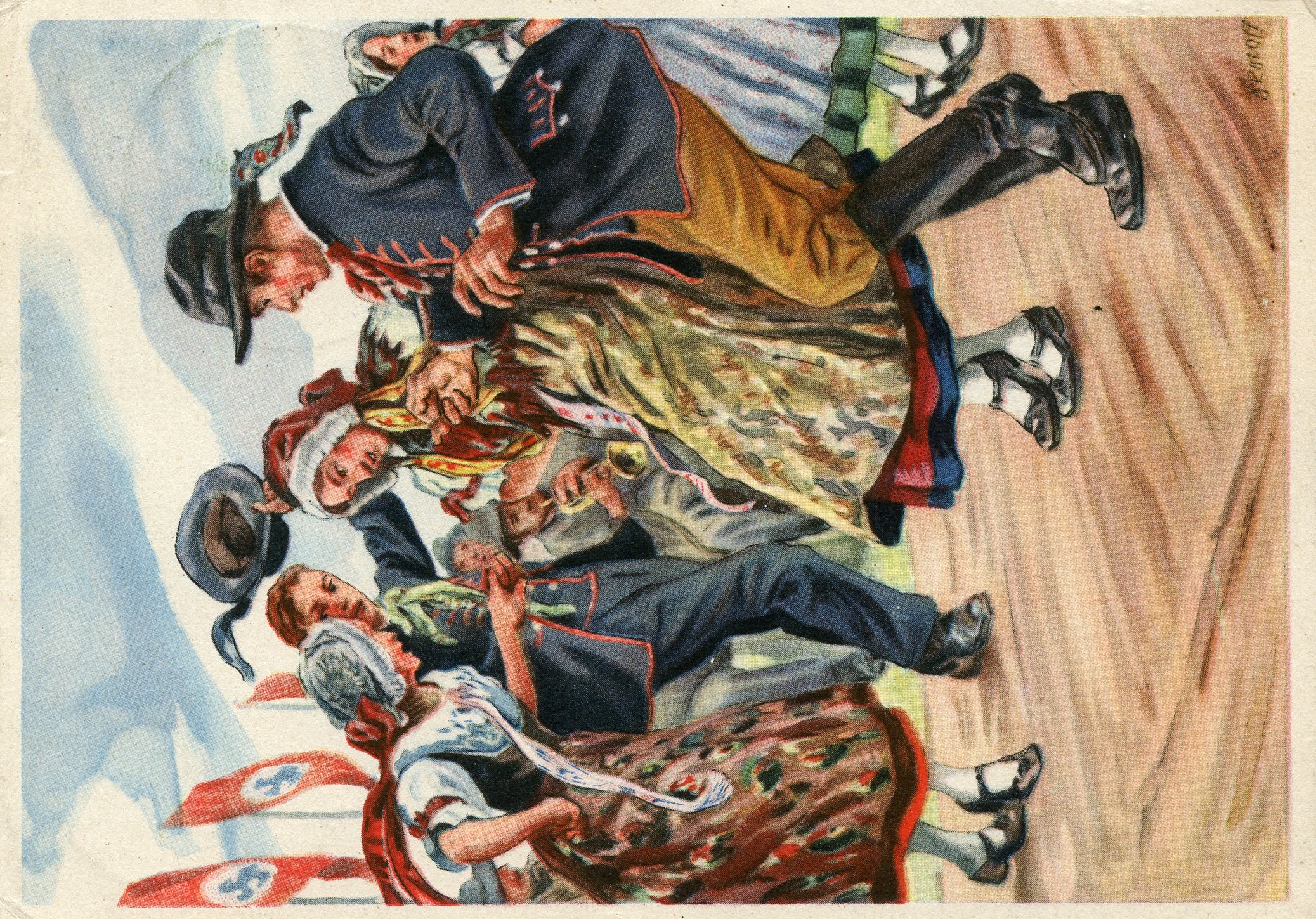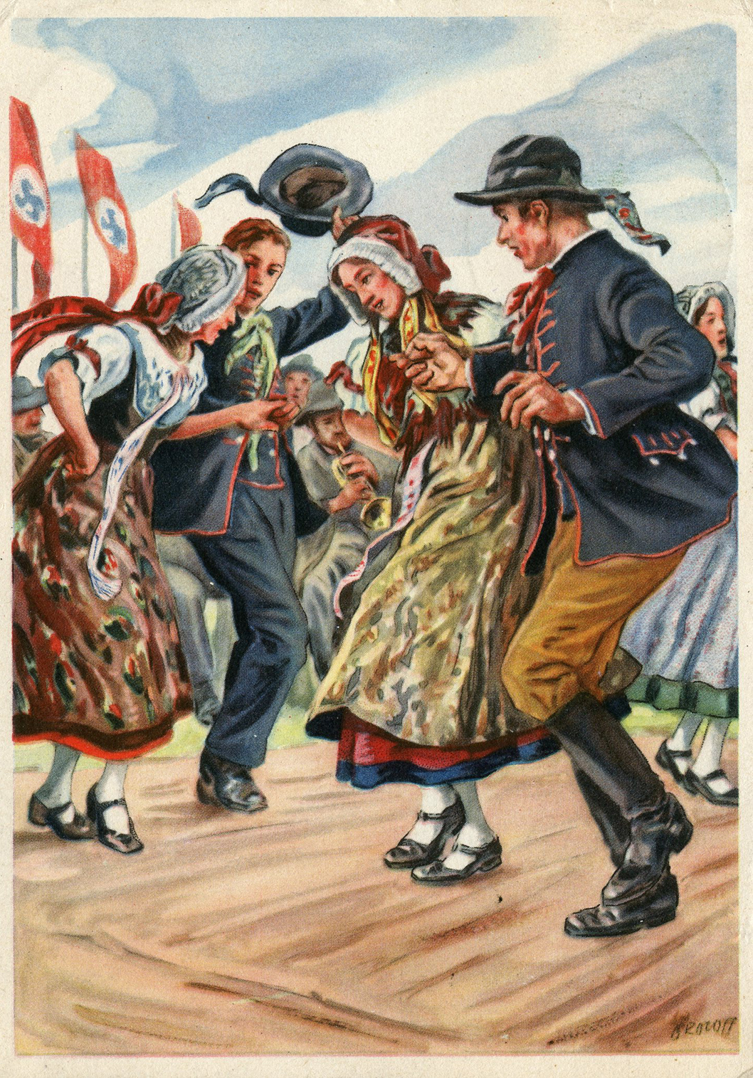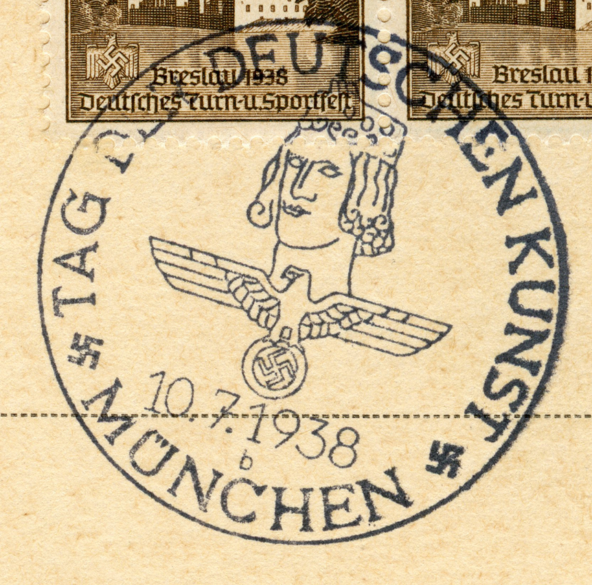 [Below: Here we see that this postcard was produced for the 'Deutsches Turn-und Sportfest' (German Gymnastics and Sports Festival). I'm guessing the dancing on the front of this postcard represented a celebration for the sporting event? The event cancel shows a date of July 29, (1938), and if you look carefully the postage stamp itself is for the event.]