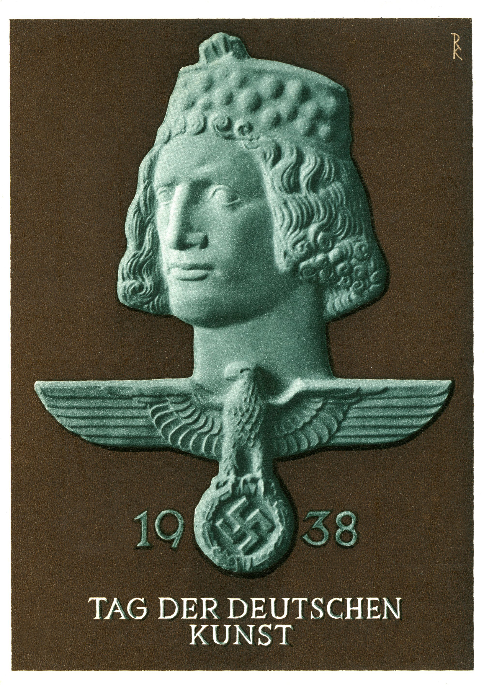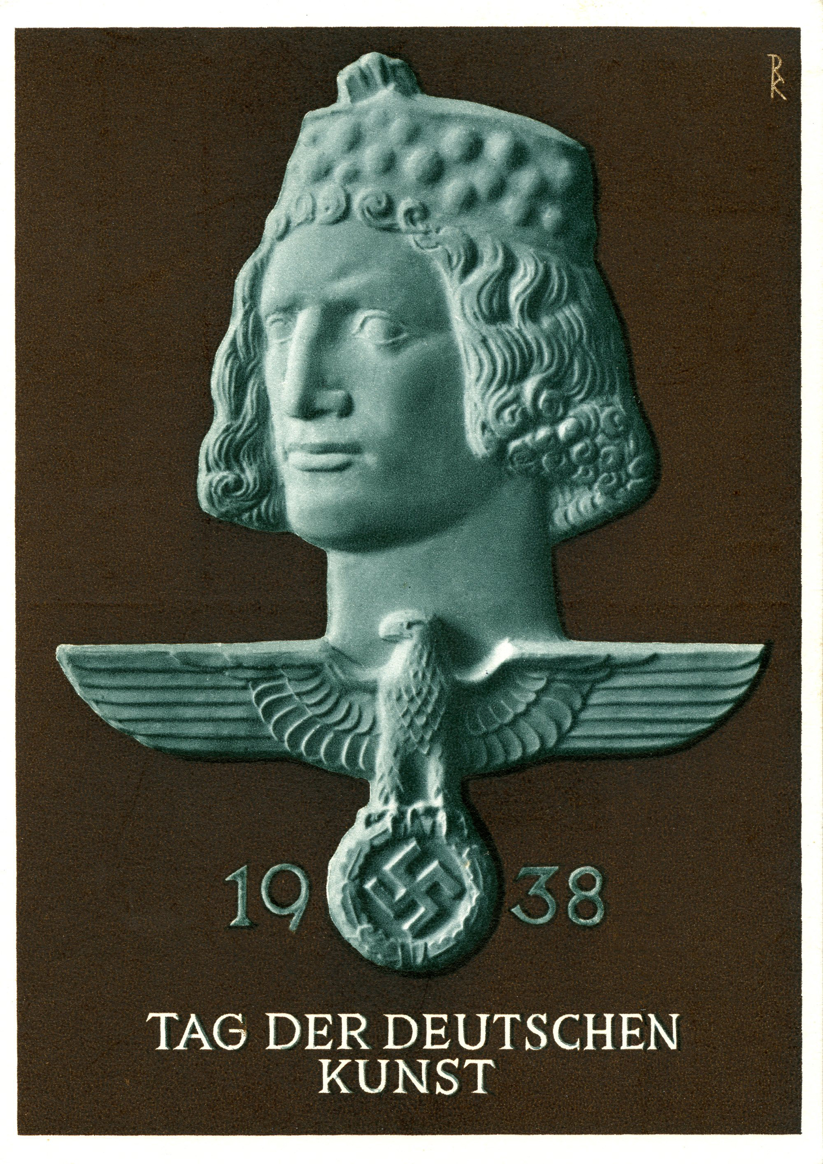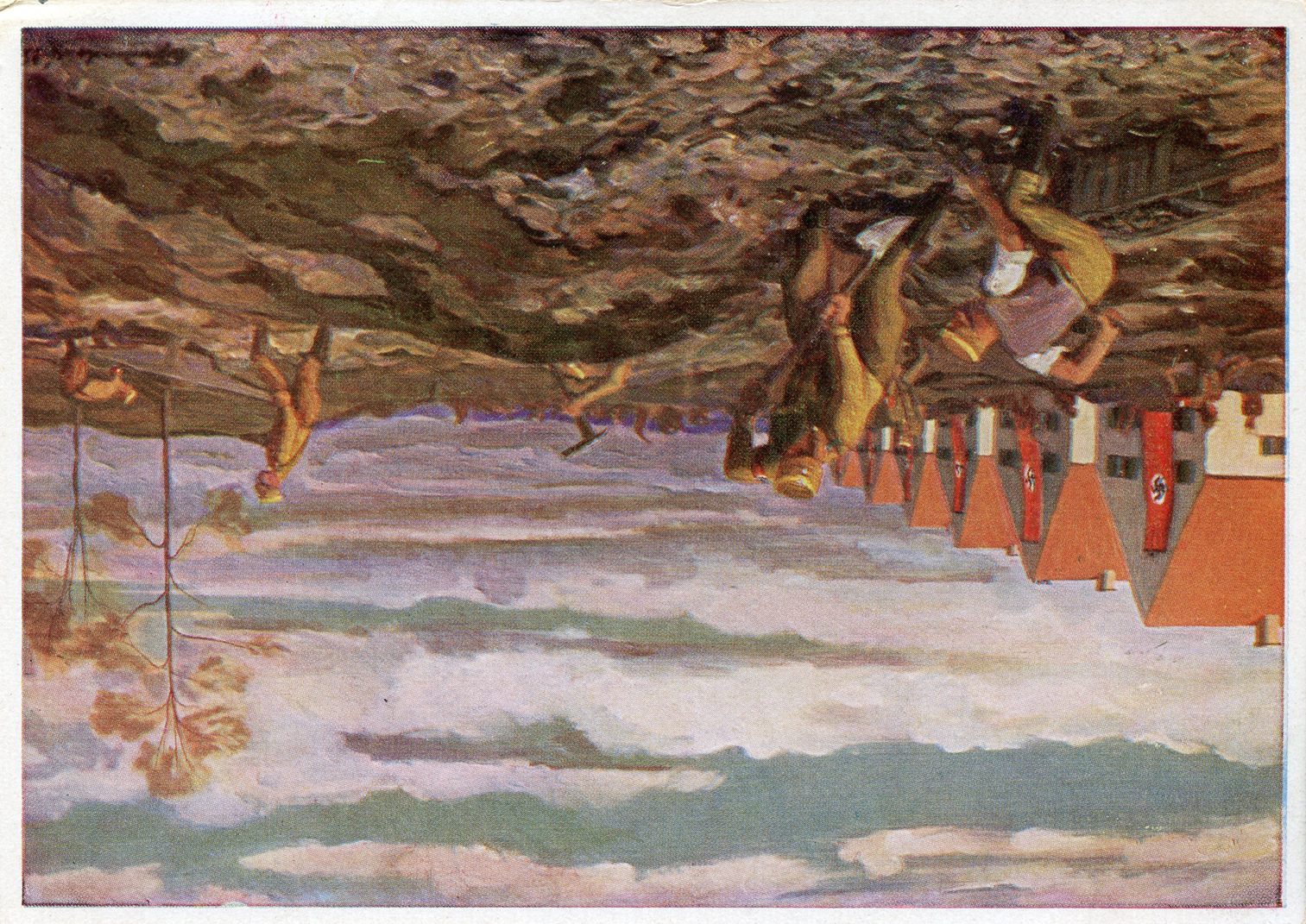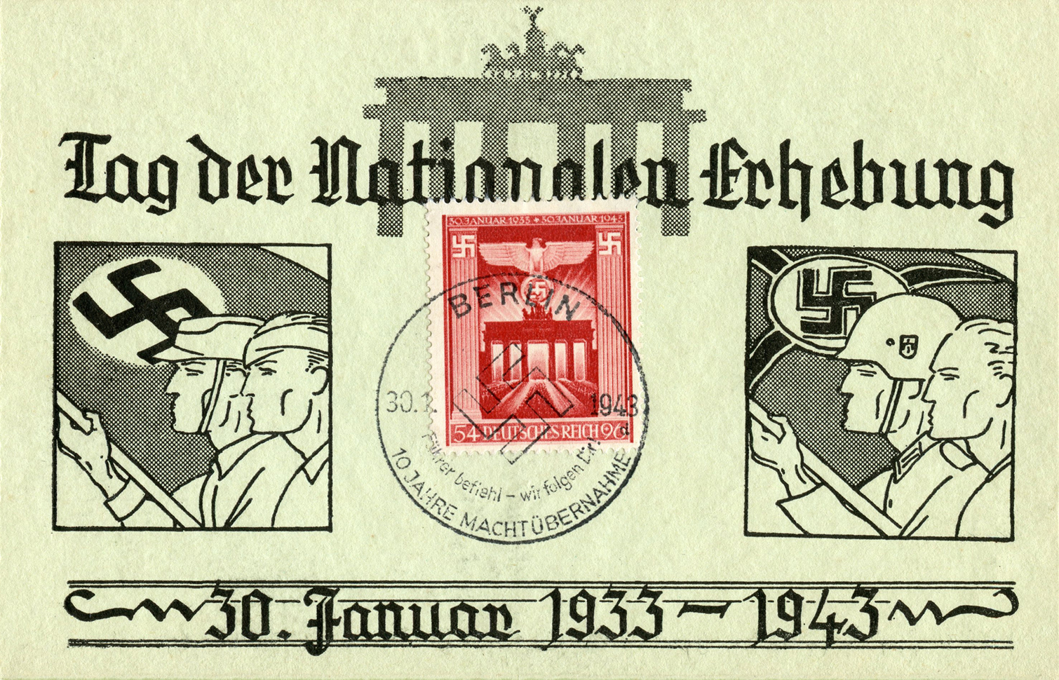 [Below: Another cool one. This is made of a think, strange type paper. It says: 'Tag der Nationalen Erhebung 30. Januar 1933 - 1943' (Day of National Uprising January 30, 1933–1943). I've seen another version of this postcard that is a different color.]