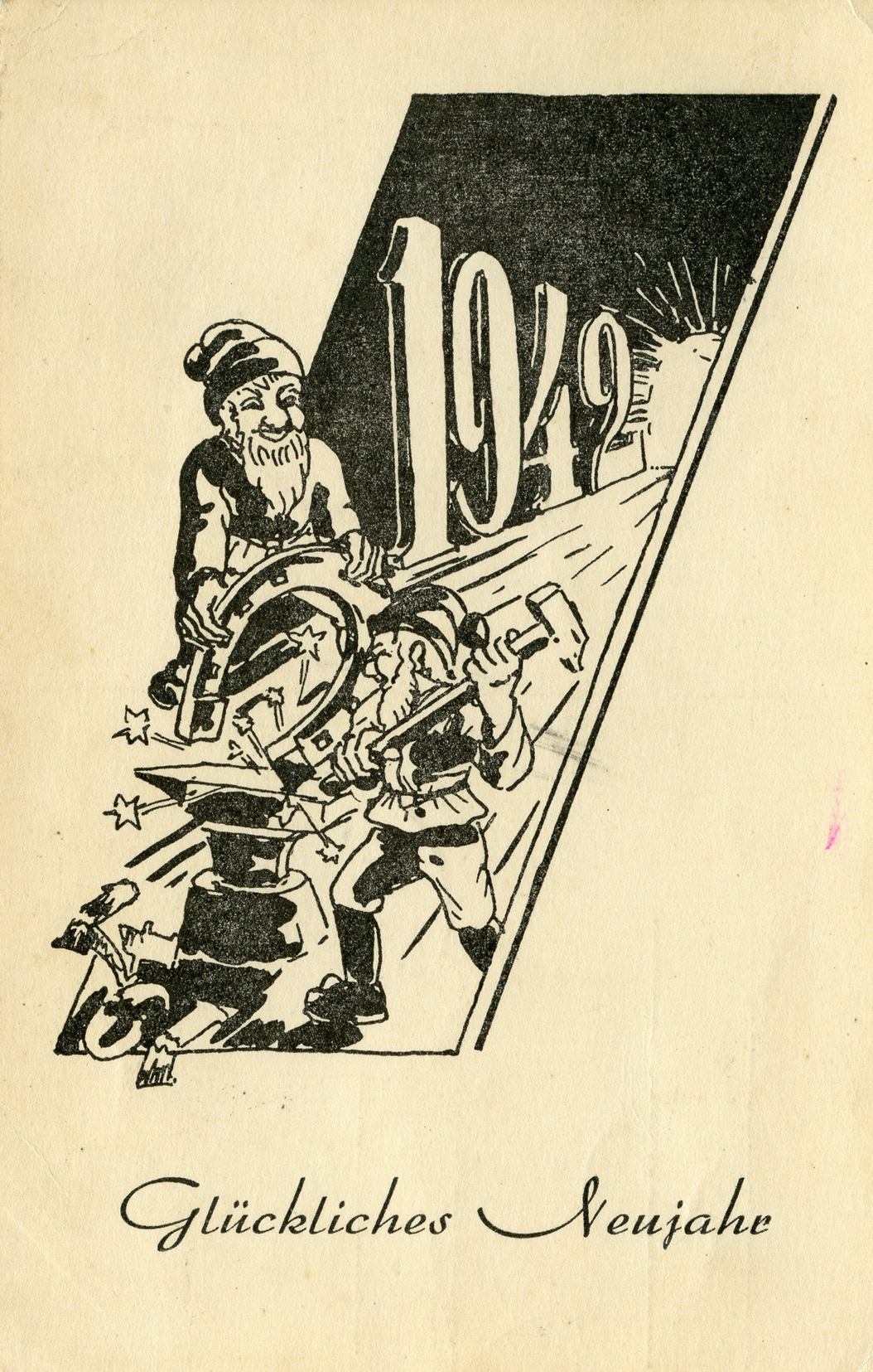[Below: Those Satanic dwarves return on this 1942 New Year Year's postcard. You can see 1941 battered on the floor beneath the anvil, while they are put on the finishing touches to a lucky horseshoe.]