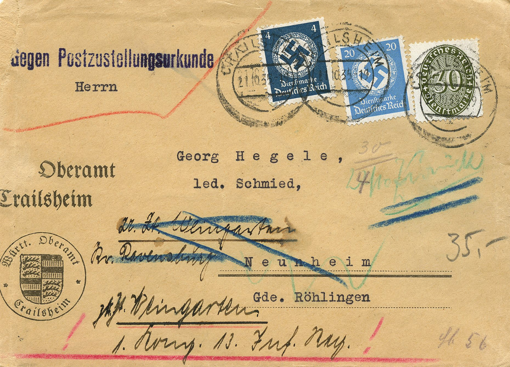 [Below: This is an official government envelope sent 'Gegen Postzustellungsurkunde', or certified. It is from Crailsheim, a town in the German state of Baden-Württemberg. It is postmarked on October 21, 1935 and uses two official Third Reich stamps and one older imperial stamps, which were being phased out.]