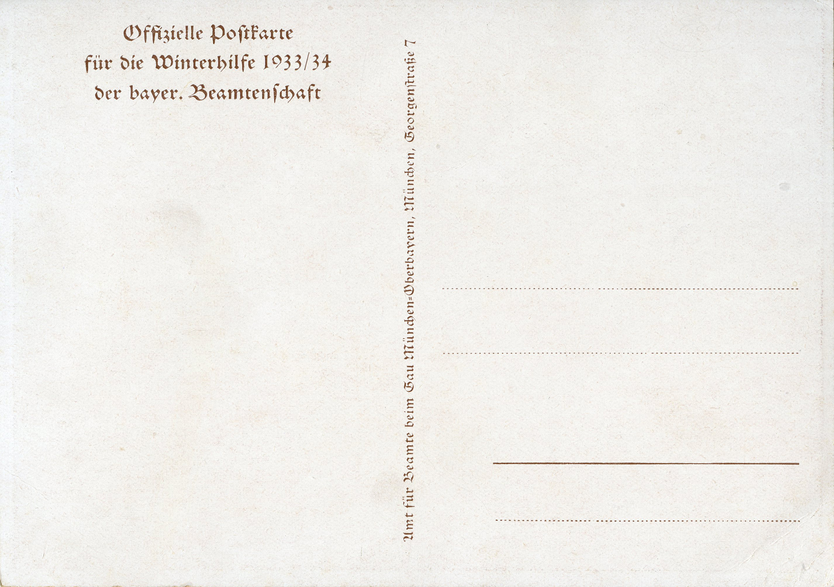 [Below: A cool postcard that says 'Bayrisches Beamten Notopfer zur Winterhilfe 1933 - 1934' (Bavarian Civil Servants' Emergency Donation for Winter Relief 1933 - 1934).]