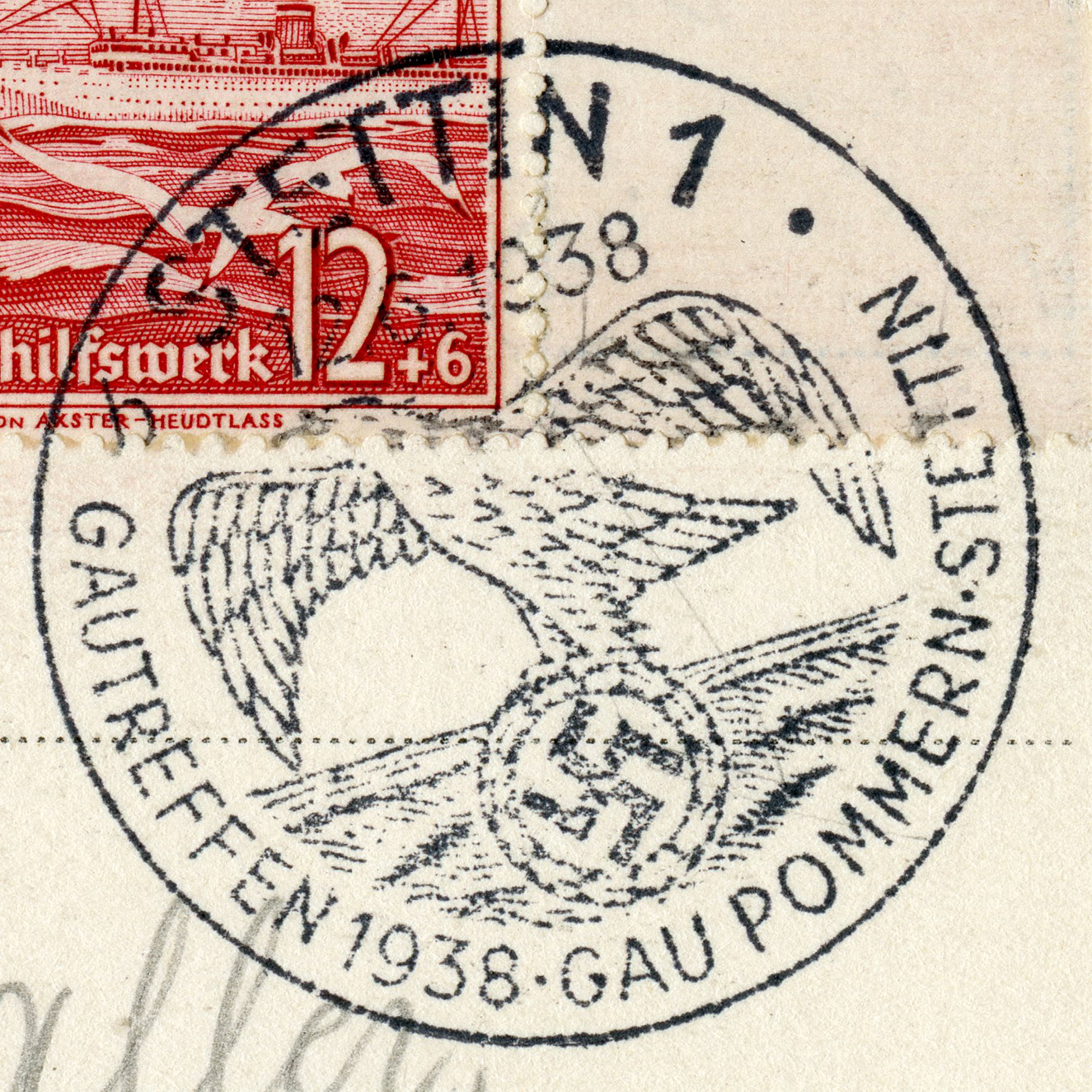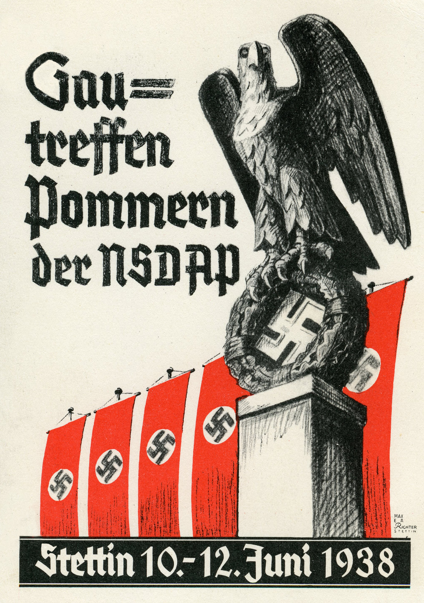 [Below: Some really eye-catching postcards on this page. This one says: 'Gau=treffen Pommern der NSDAP - Stettin 10.-12. Juni 1938' (Pomeranian Regional Meeting of the Nazi Party - Stettin, June 10-12, 1938).]