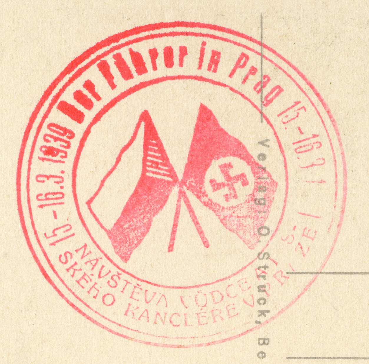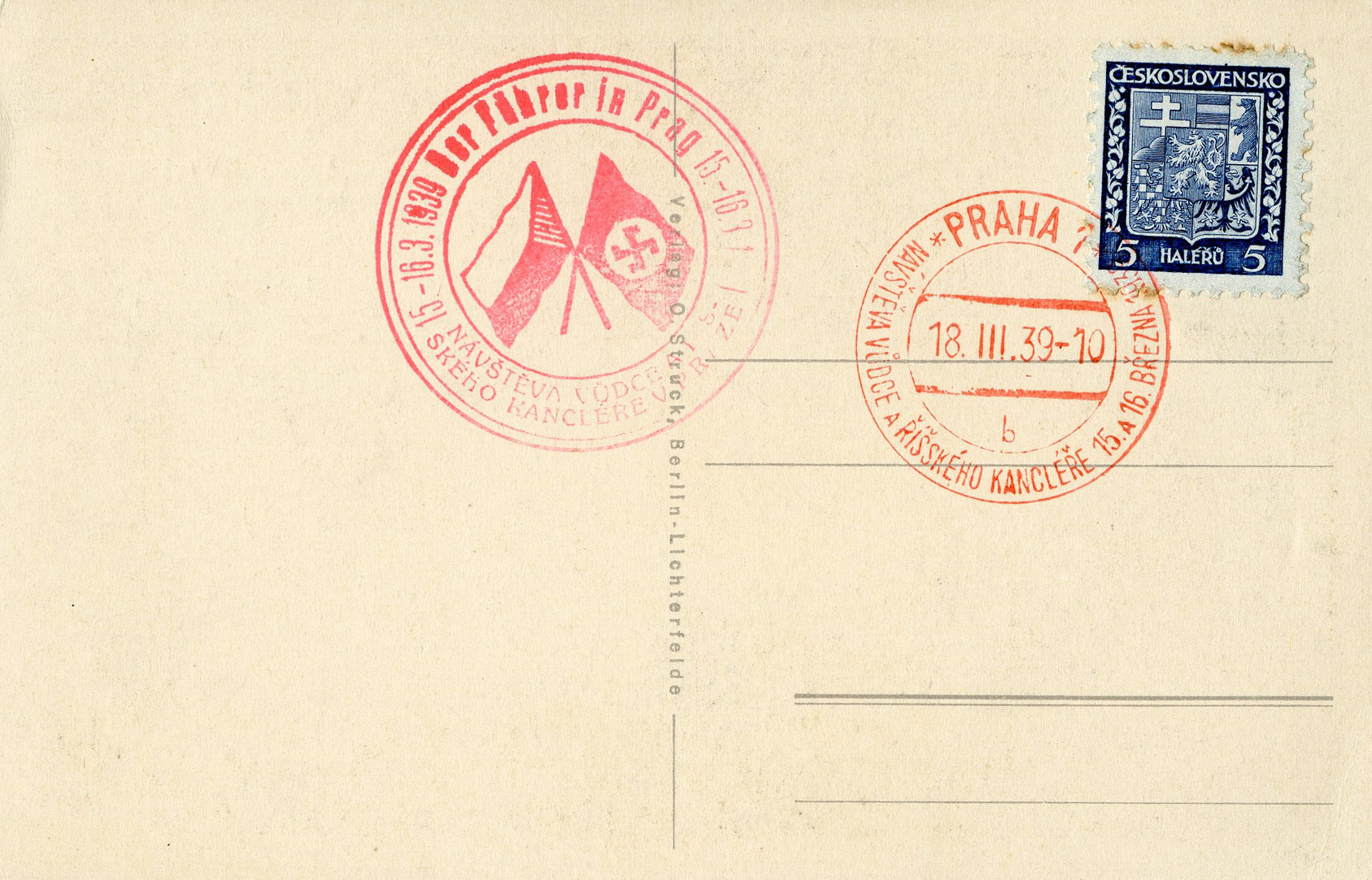 [Below: I've seen just about every cancel there is for Bohemia and Moravia (Czechoslovakia), but never this one before now. It is very rare and is for 'Der Führer in Prag' (The Führer in Prague) visit on March 15-16, 1939. Note the words 'Der Führer' are missing from this postcard.]