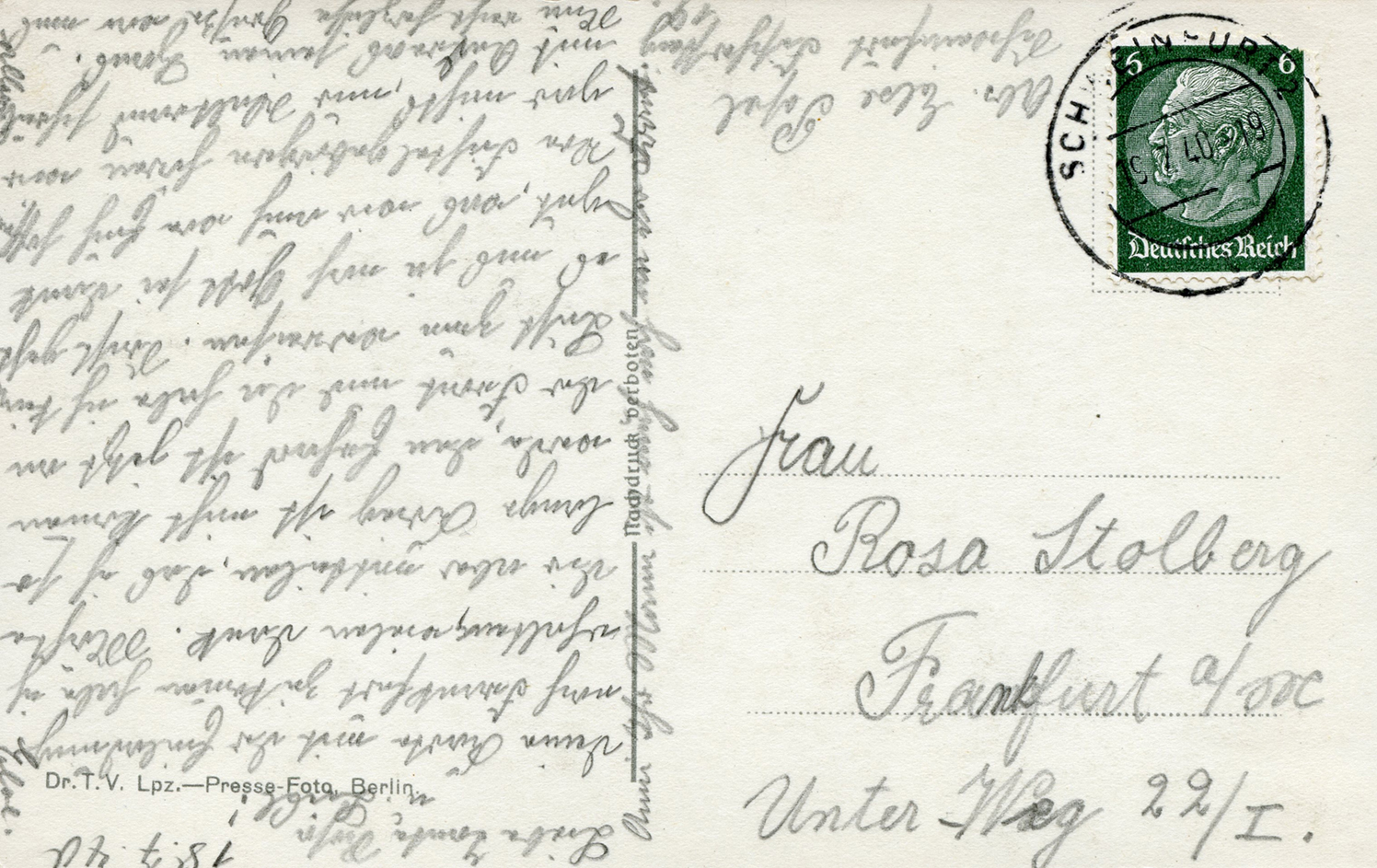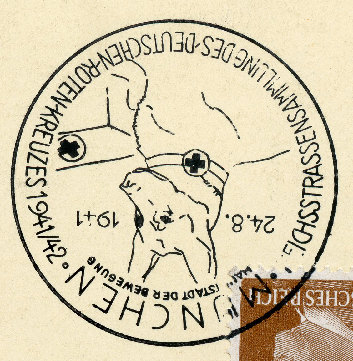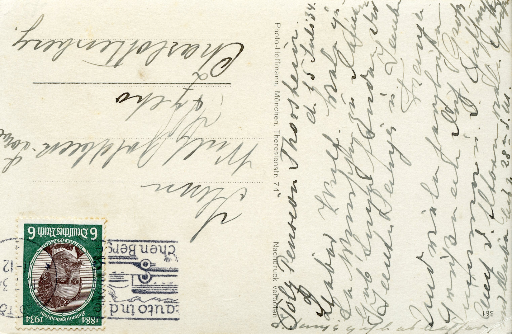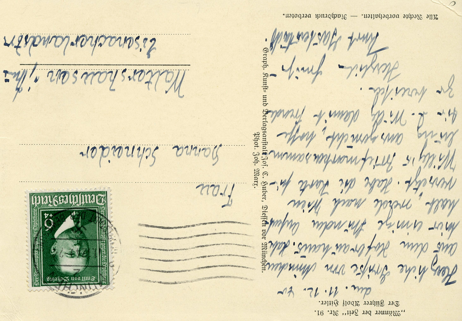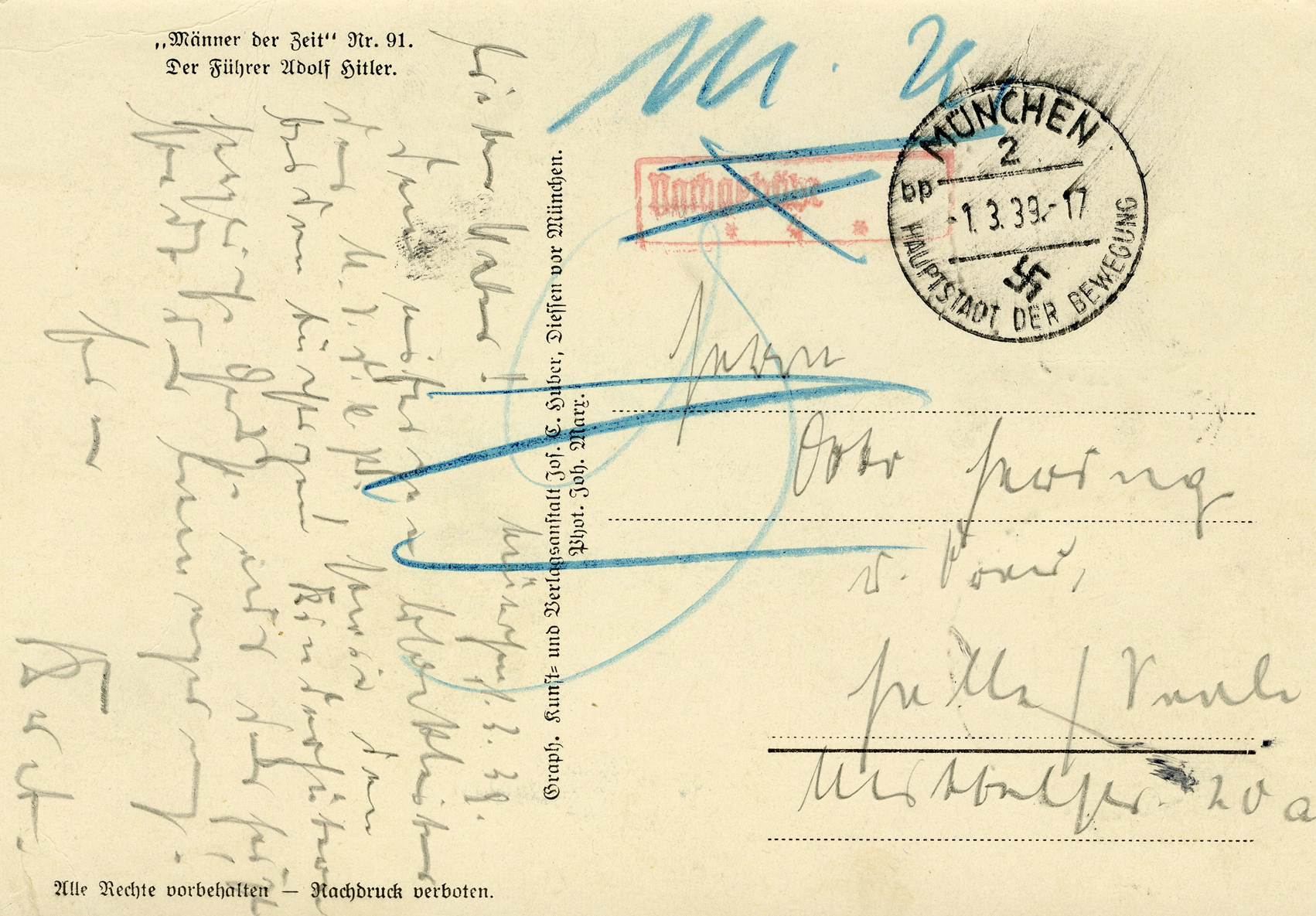 [Below: Reverse. Note the red stamp which says 'nachgebühr', this means 'additional charge', but then it was crossed out. I think they didn't realize the postage is on the front, then later saw it.]