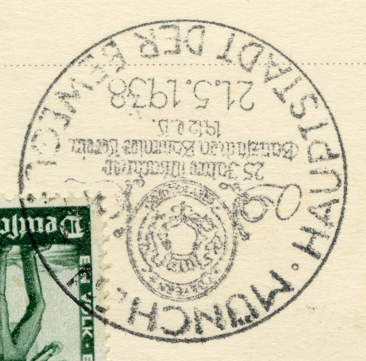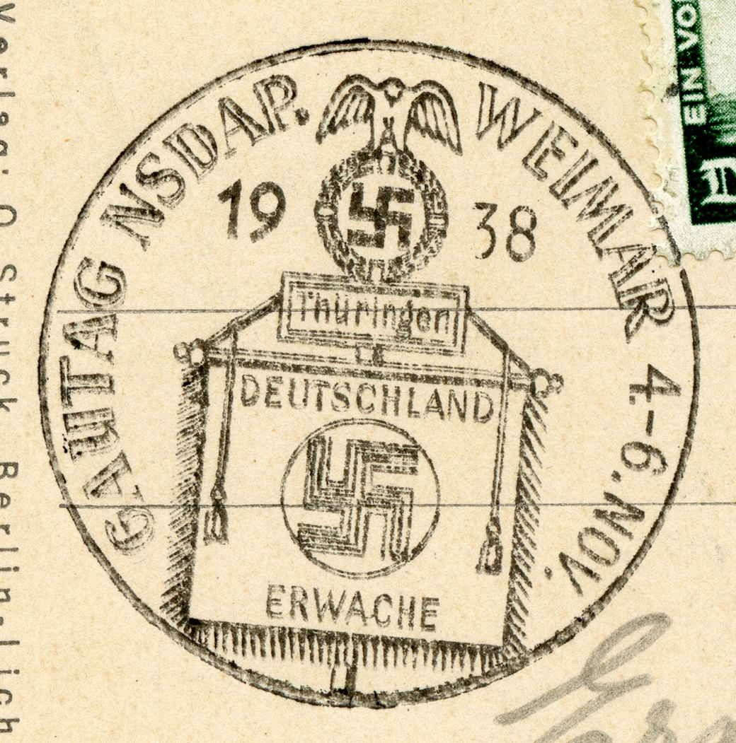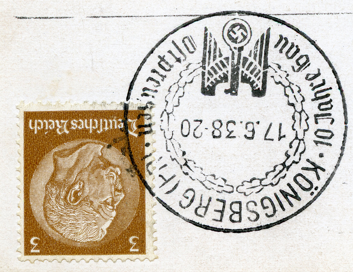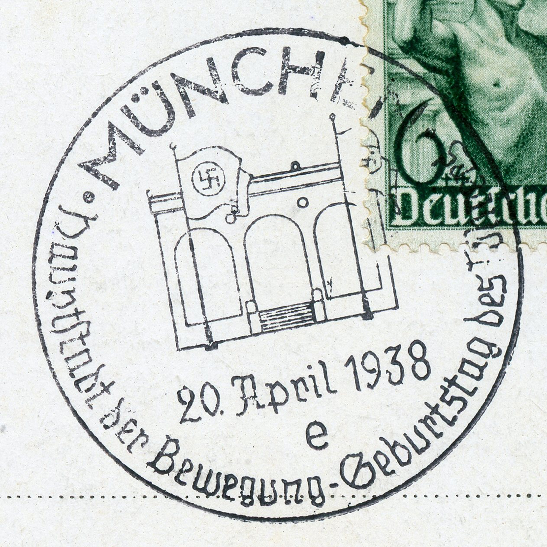 [Below: A pretty common postcard from around 1938... until you see the other side and the cancel.]