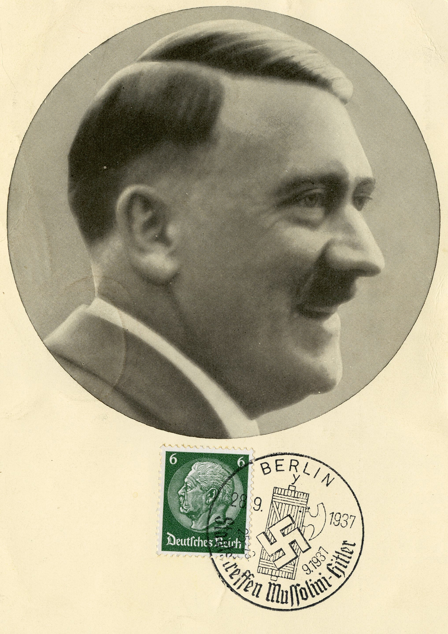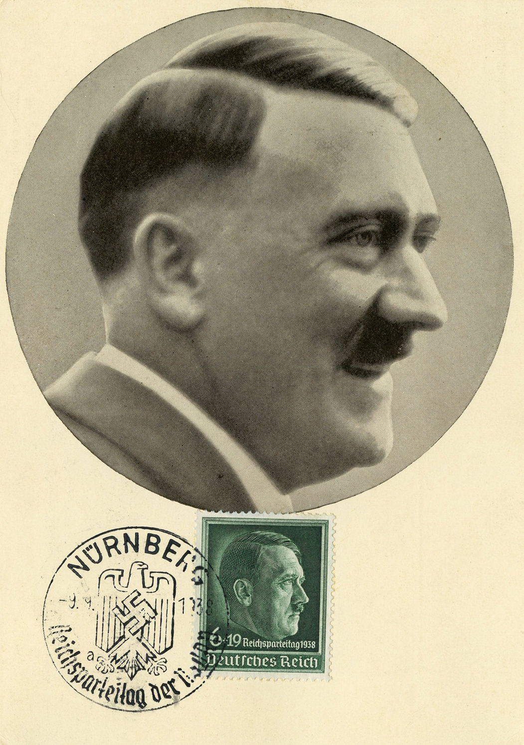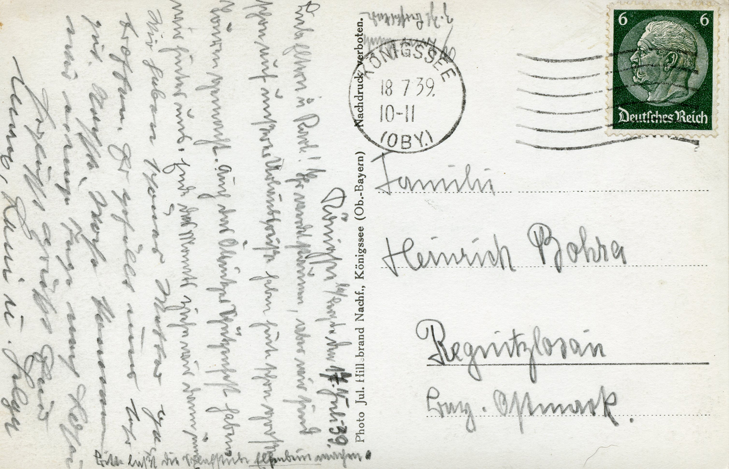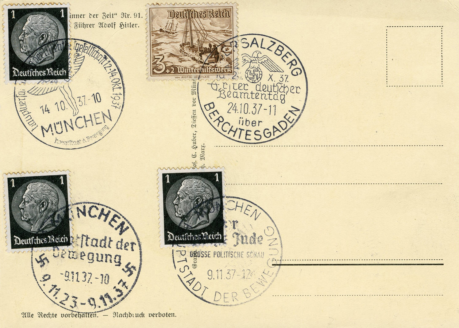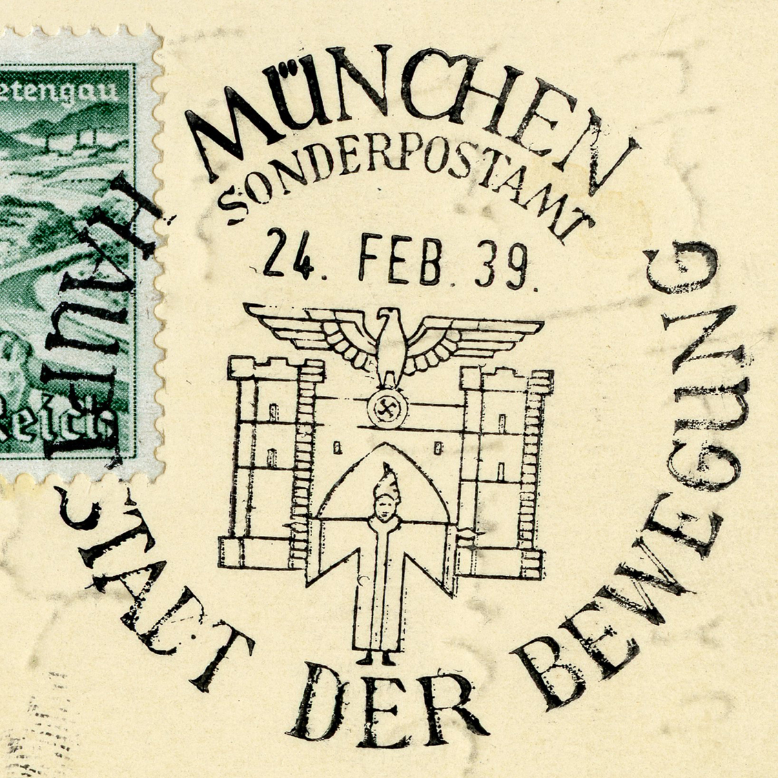 [Below: A pretty common postcard from around 1938... until you see the other side and the cancel.]
