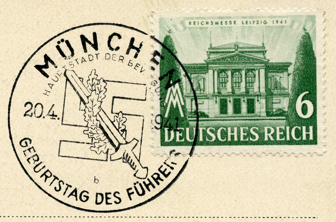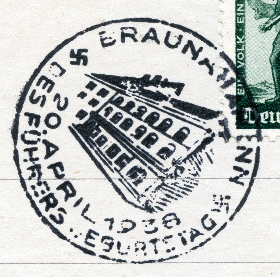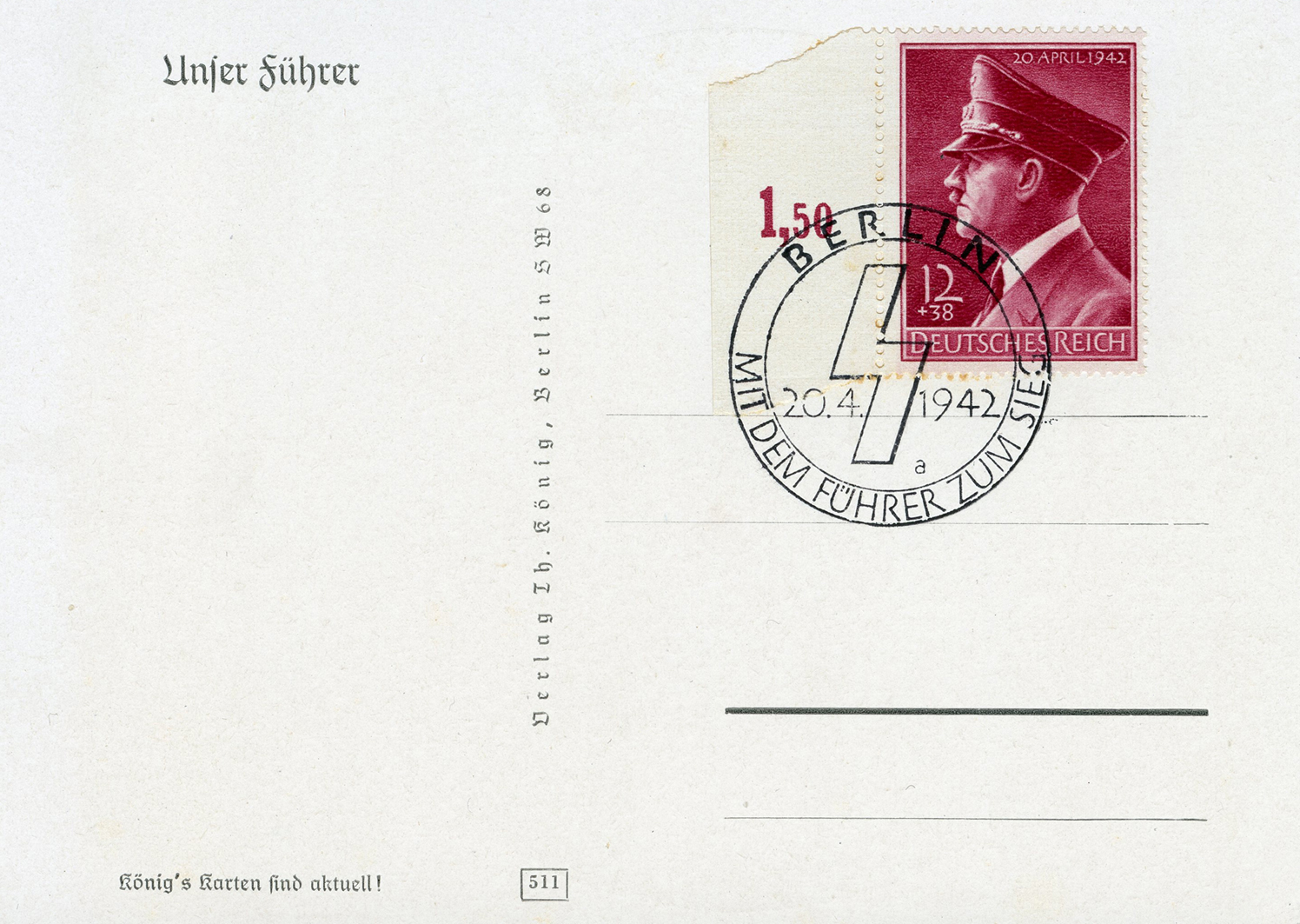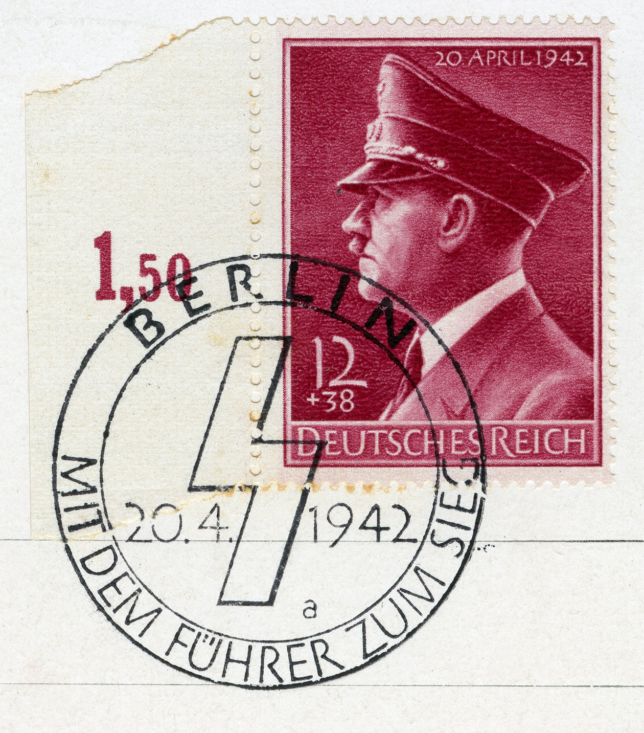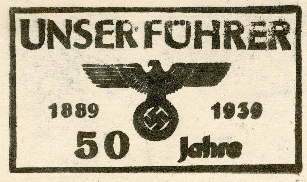 [Below: Reverse. This sieg rune cancel says 'Mit dem Führer zum Sieg' (With the Führer to Victory), from April 20, 1942.]